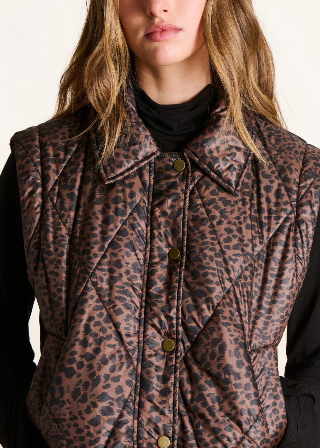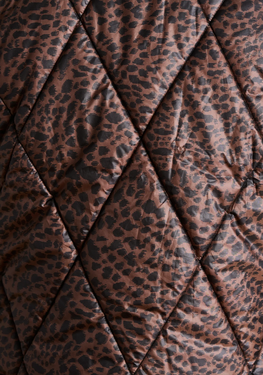 Stay warm in style with the Faye Leopard Puffa, a short padded jacket featuring a chic leopard print lining. The front zip closure and removable long sleeves offer versatile wear, while its eco-friendly certification ensures a conscious choice without sacrificing fashion. Perfect for adaptable layering and bold looks.
