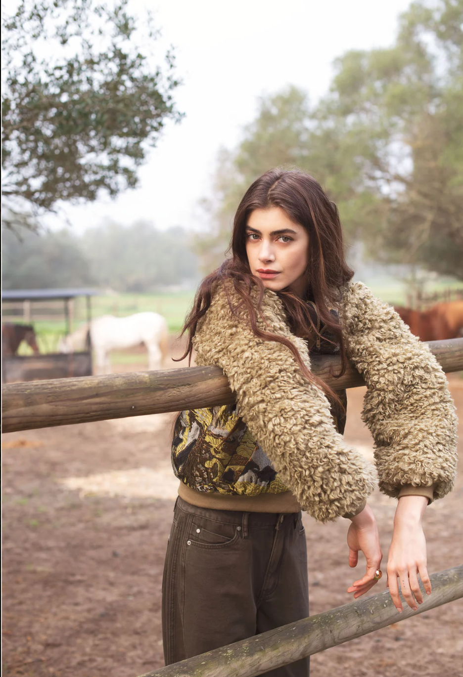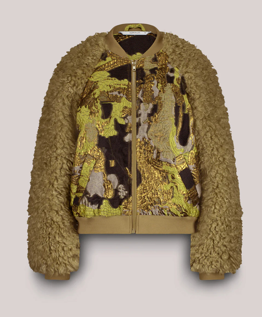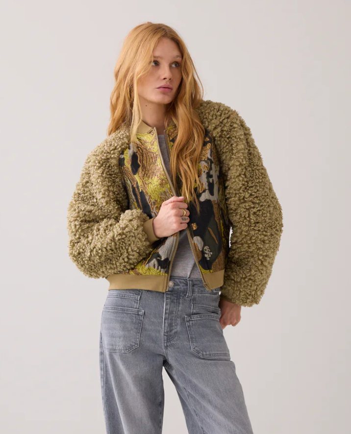 This jacquard bomber jacket has an eye-catching pattern and teddy sleeves. The model is lightly quilted and suitable as a transitional jacket or for indoors. Finished with a shiny satin lining and soft ribbed edging.