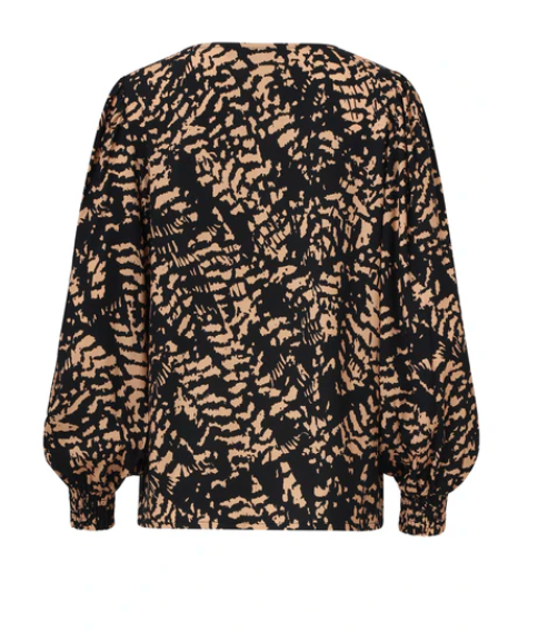 Upgrade your wardrobe with this stylish, loose-fitting top, crafted from 100% viscose for a soft, breathable feel. The top features a flattering V-neckline and long puff sleeves for a fashionable and feminine look. The abstract black and camel print makes this piece a real eye-catcher, and the short, loose fit adds a trendy, modern twist to your outfit. Key features: - 100% viscose, lightweight and breathable fabric - V-neckline for an elegant look - Long puff sleeves for added volume and style - Abstract black and camel print for a striking look - Loose, short fit, perfect for a trendy outfit
