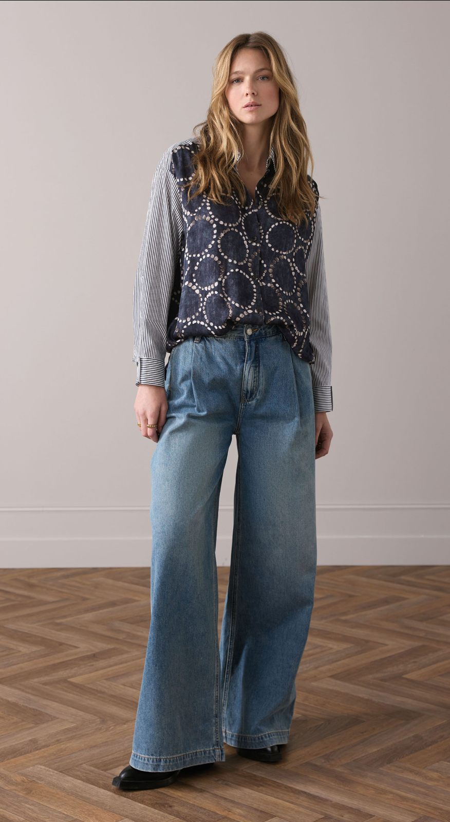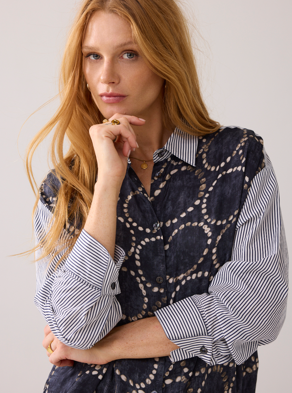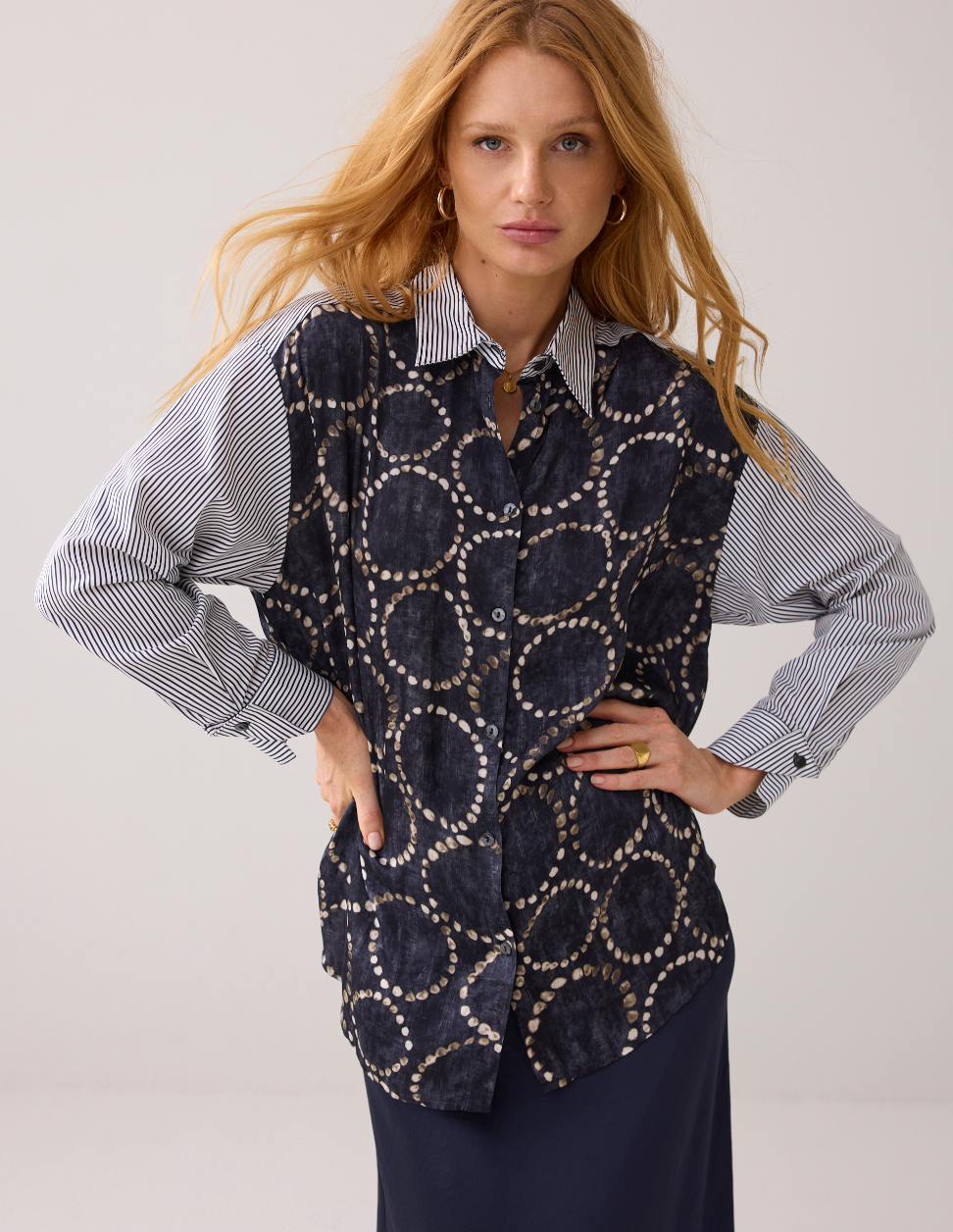 This shirt blouse has a unique fabric blend with shiny Ecovero fabric in pearl print and striped cotton elastane. This shirt blouse has a lowered shoulder seam and wide, adjustable cuffs that can be worn in multiple ways.