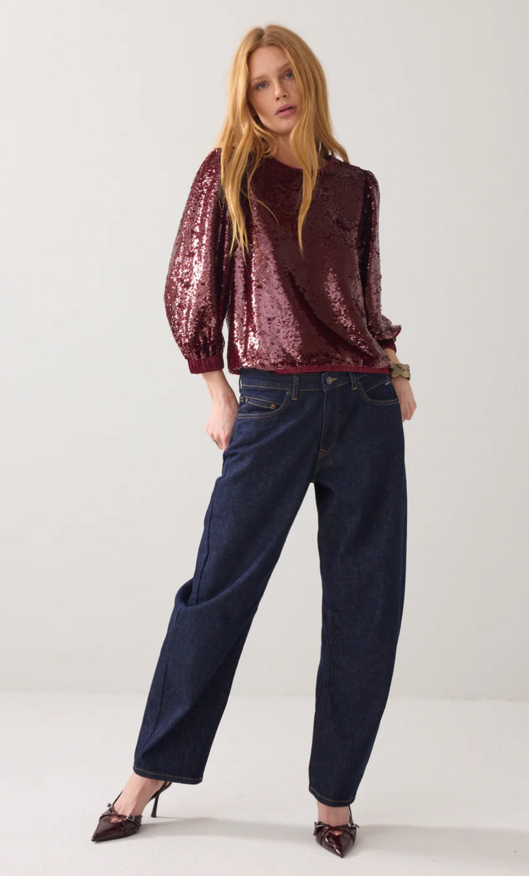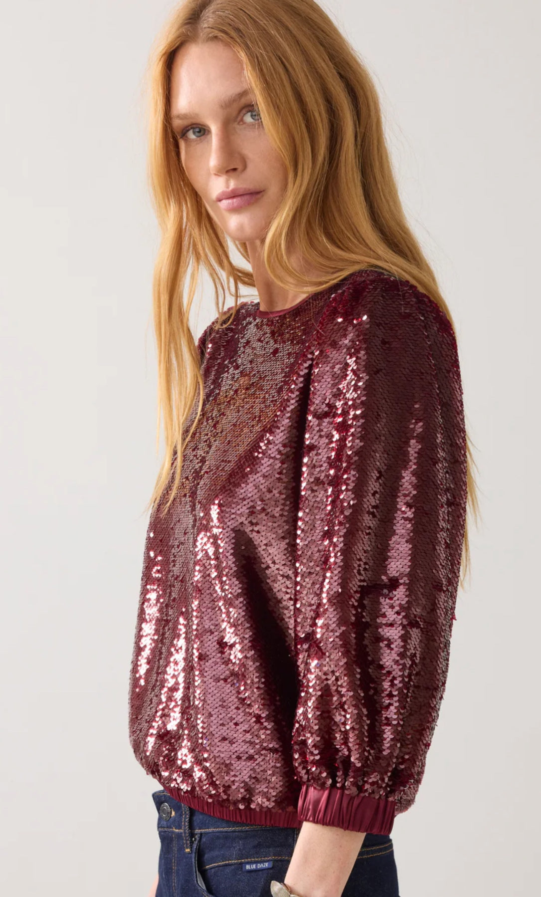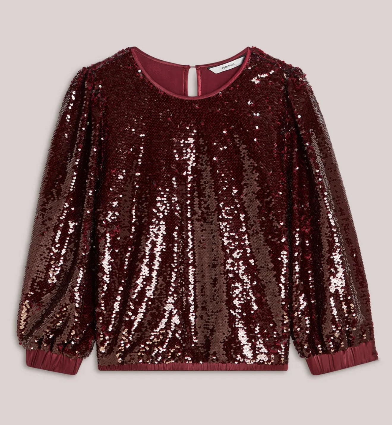 This refined sequin top is lined with soft viscose for a smooth, comfortable feel. The satin neckline and delicate back slit with button closure add a polished touch, while the smocked hem and cuffs create a softly draped silhouette. Style it with the matching skirt 6s1346 for an effortless, coordinated look.