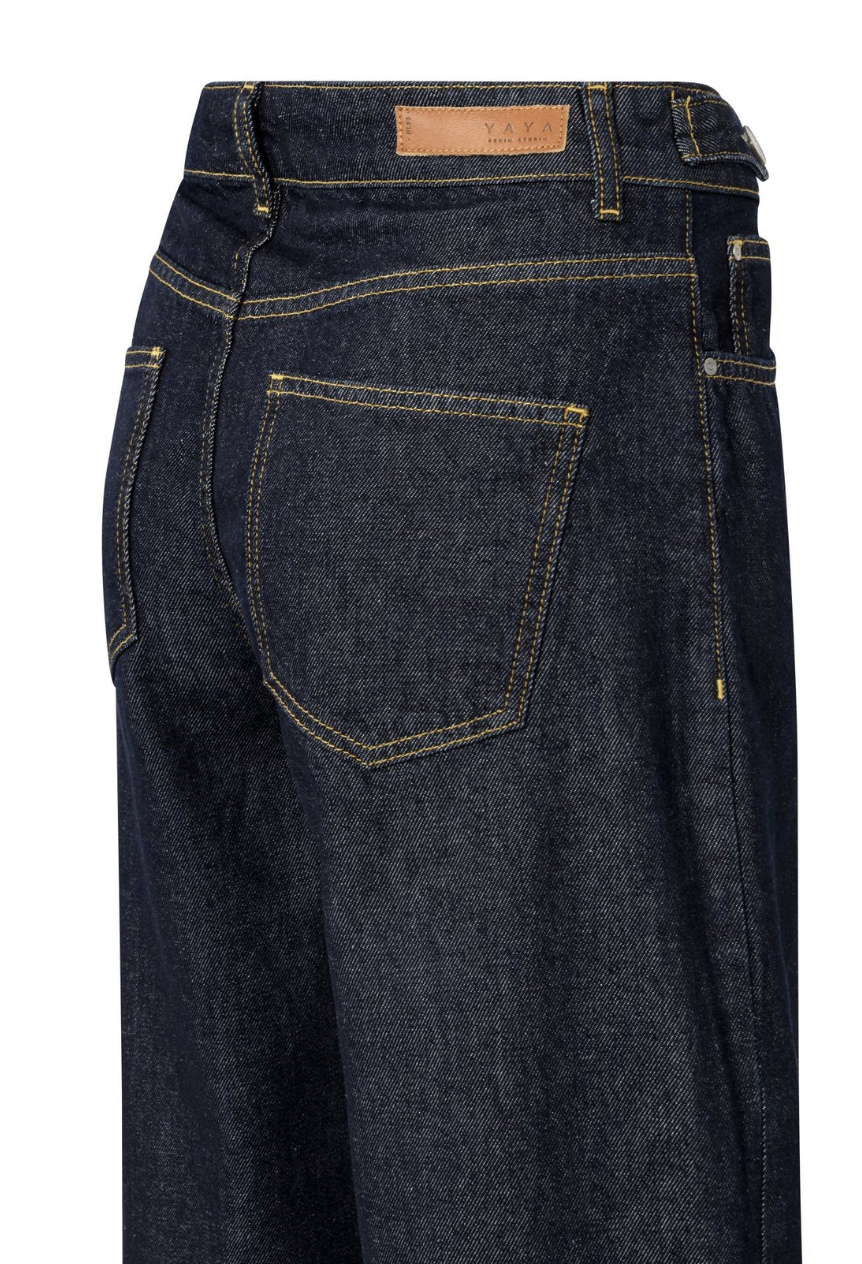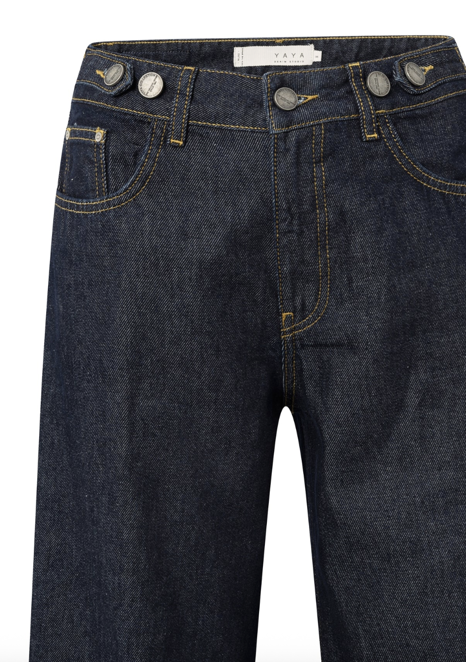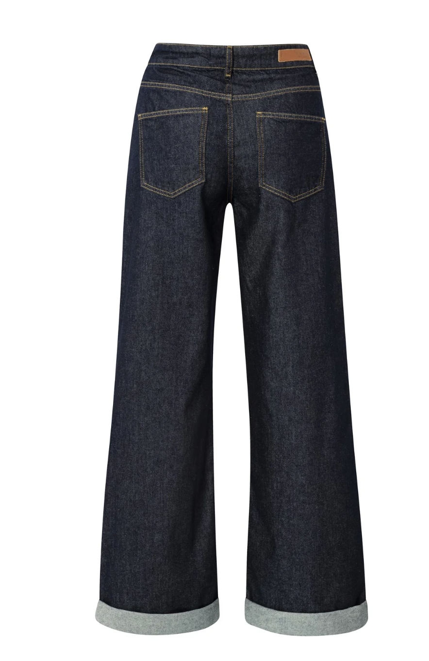 Crafted from sturdy denim, these loose fit jeans feature a high waist, straight legs, and a rolled-up hem for a casual finish. Designed with classic five-pocket styling, contrast stitching, and a double button closure. A versatile piece that pairs effortlessly with both blouses and T-shirts for a laid-back yet polished look. Inseam length: 32. The model is 178 cm and wears size 36.