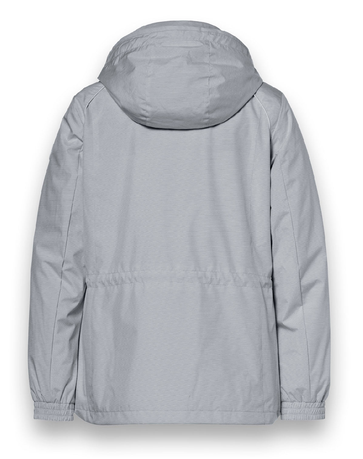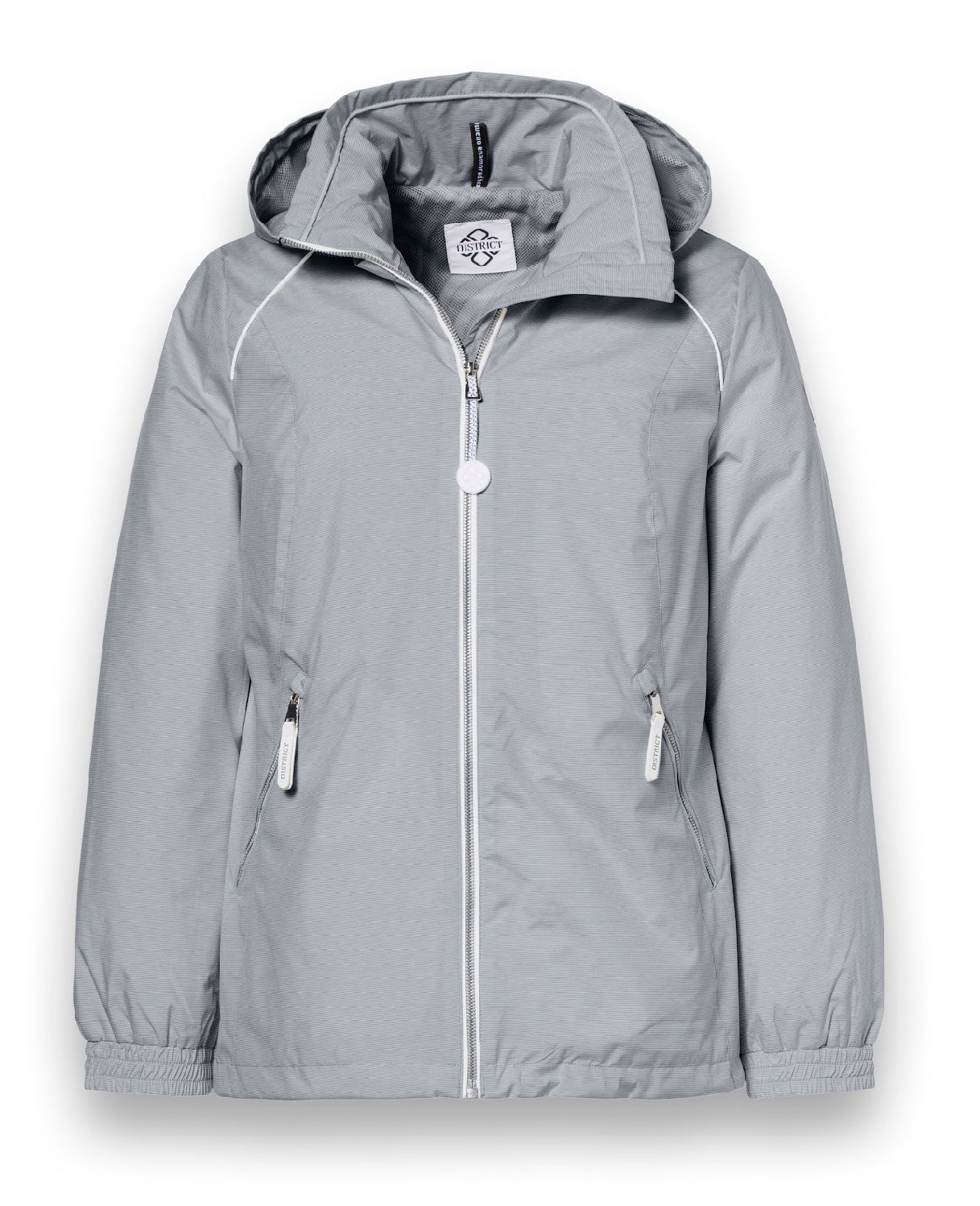 This District jacket is an ideal addition for the warmer seasons, offering practical side-zip pockets, a front zip fastening, an adjustable waist toggle for shaping, and a detachable hood. It effortlessly complements any outfit and is a timeless staple in your wardrobe.