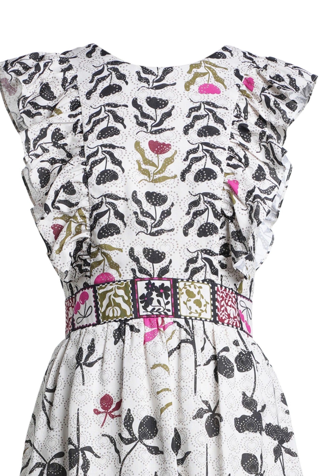 Stunning pink and white printed cotton dress in shorter length with beautiful tailorin on the waist and Emily Lovelocks signature colourful embelishments.