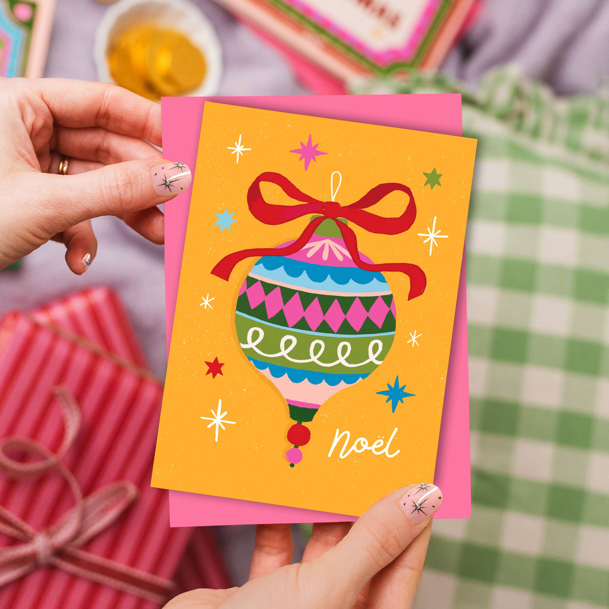 This colourful and fun illustrated Christmas card has the caption 'Noel' in a handwriting-style font for a cosy festive feel. The bold hand drawn design features a kitsch vintage-inspired bauble illustration in a joyful rainbow colour palette. Product Details: Supplied with pink envelope Blank inside for your own message Professionally printed in the UK Premium 350gsm card from sustainable forests 100% recyclable, packaged without plastic Card Size: A6 (105 x 148 mm | 4.1 x 5.8 in) Packaging options: Biodegradable clear sleeve or packaging-free (envelope nested inside card) These Christmas cards from UK based gifts brand Natalie Lea Owen, are a gorgeous way to celebrate the festive season. Illustrated by hand in Natalie's Chichester based studio and printed in the UK, these high-quality cards are full of personality and festive joy. Established in 2015, Natalie has been proudly bringing colour to the high street for over a decade with her unique, one-of-a-kind designs and signature colour palettes to make