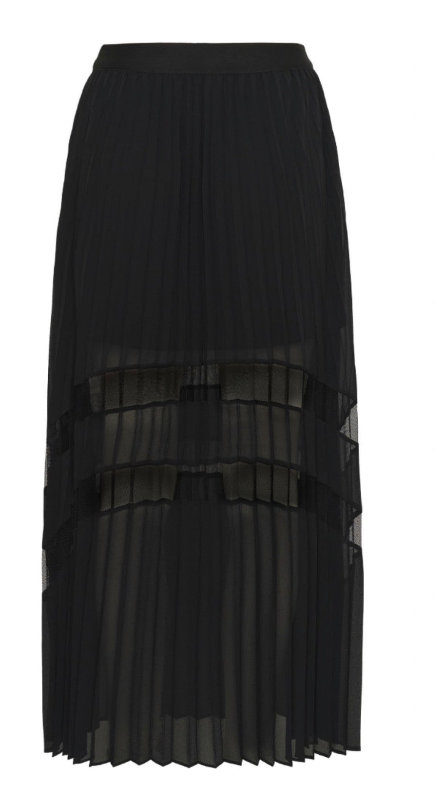 A long sunray pleated skirt made in a light floaty sheer fabric. The bottom half of the skirt has horizontal stripes of black net . There is an integral lining that reaches to above the knees. A pull on style to wear with pumps, boots, jumpers or a short sleeve evening top