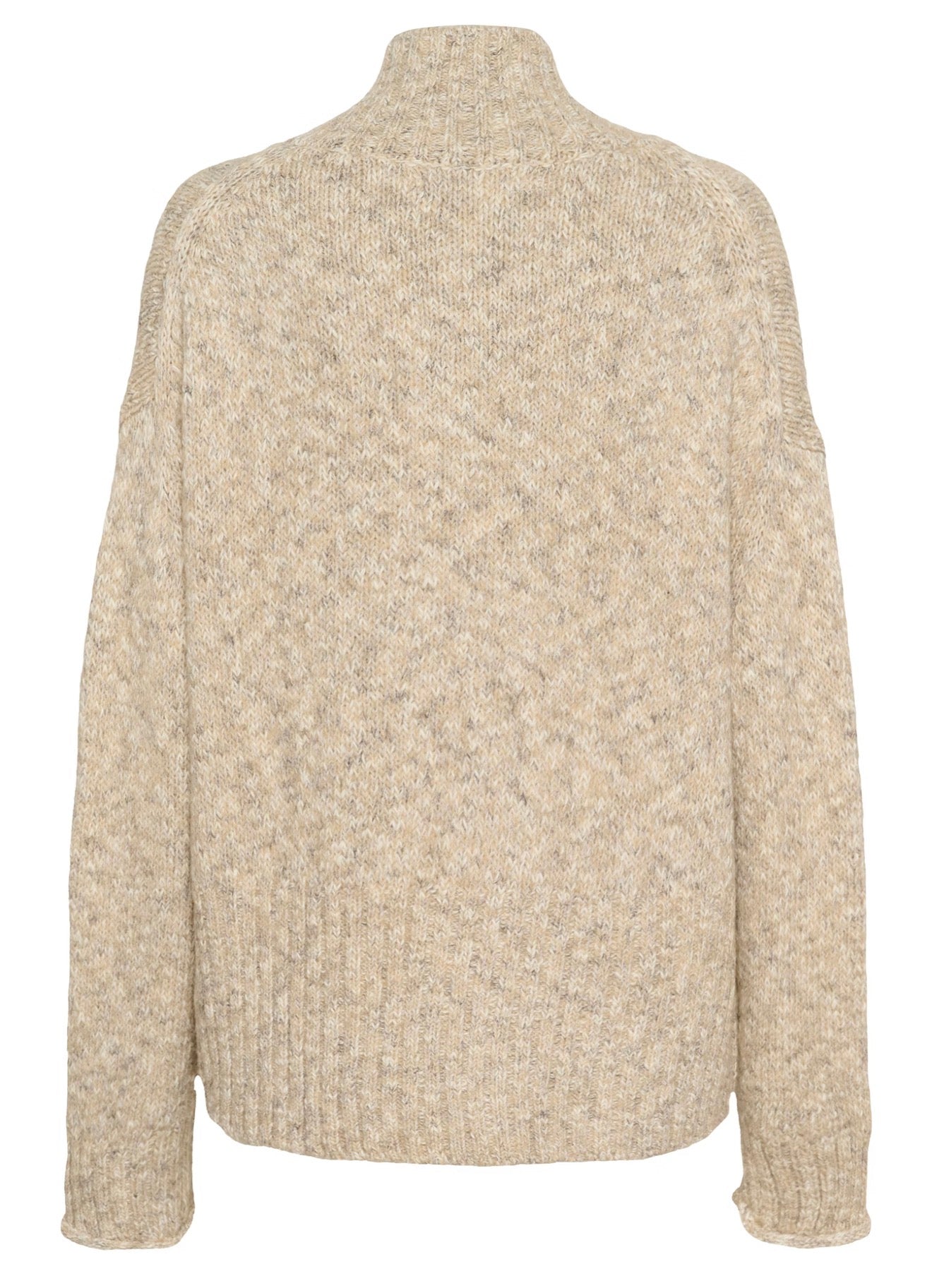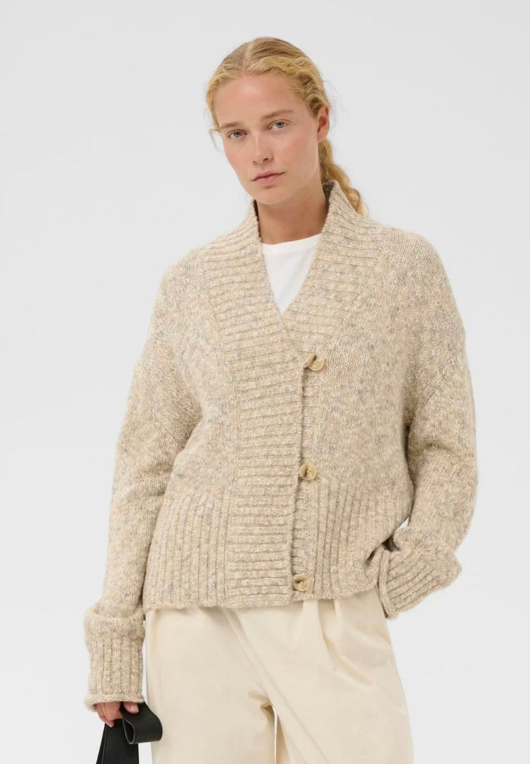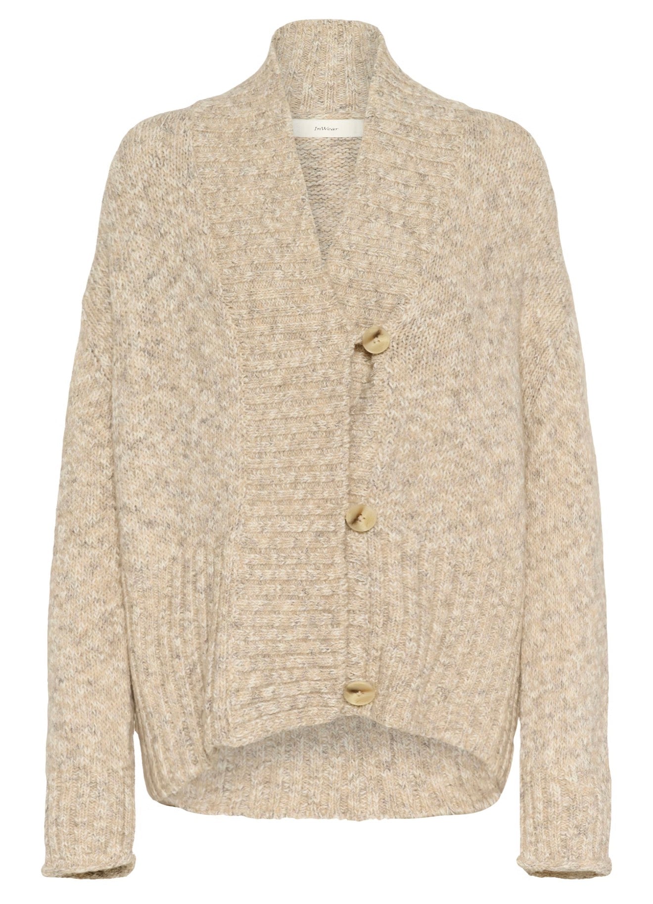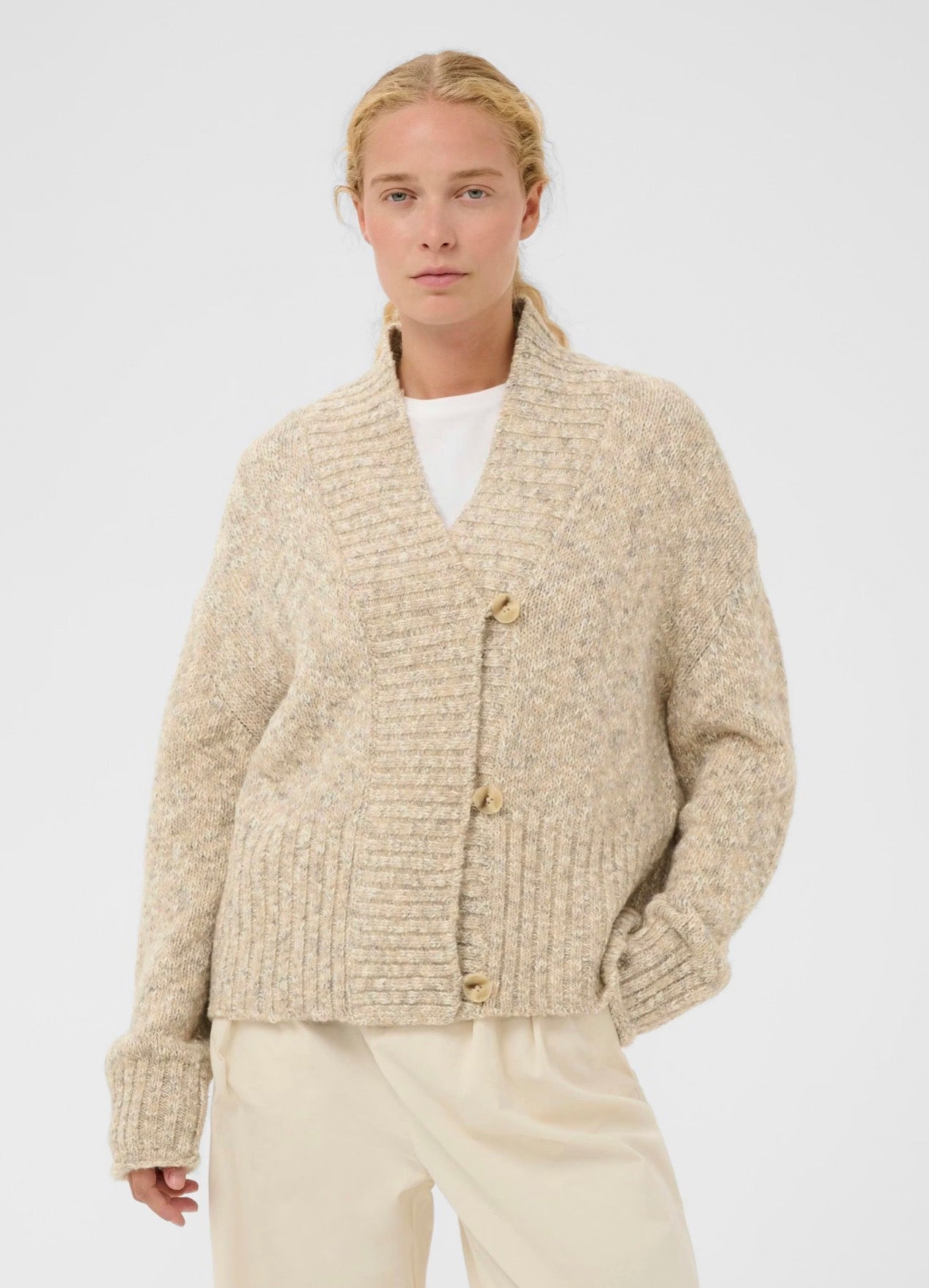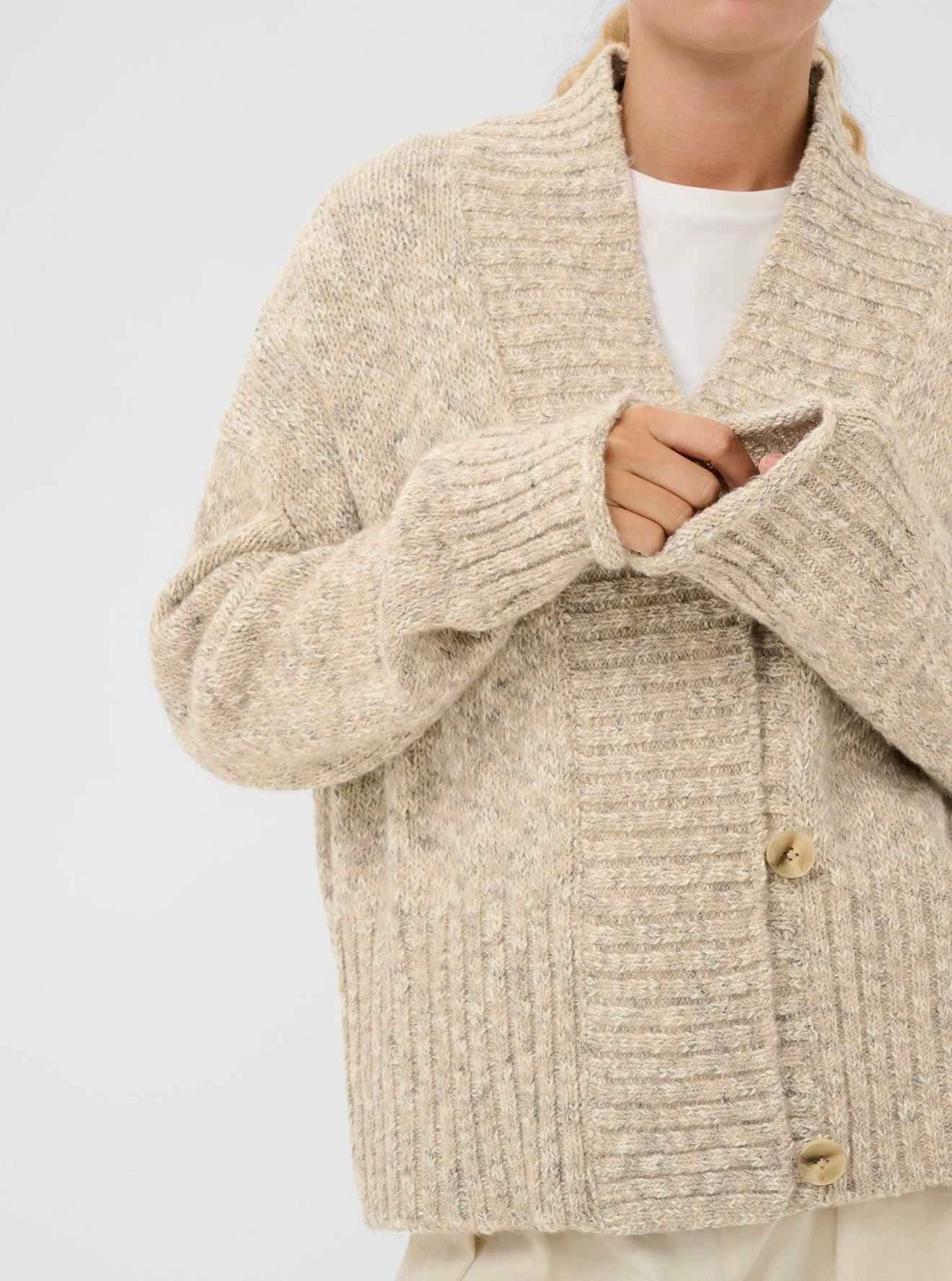 Chunky knit cardigan with a softly textured finish, relaxed silhouette, high-low hem, and oversized ribbed shawl collar. Features long sleeves and three visible front buttons.