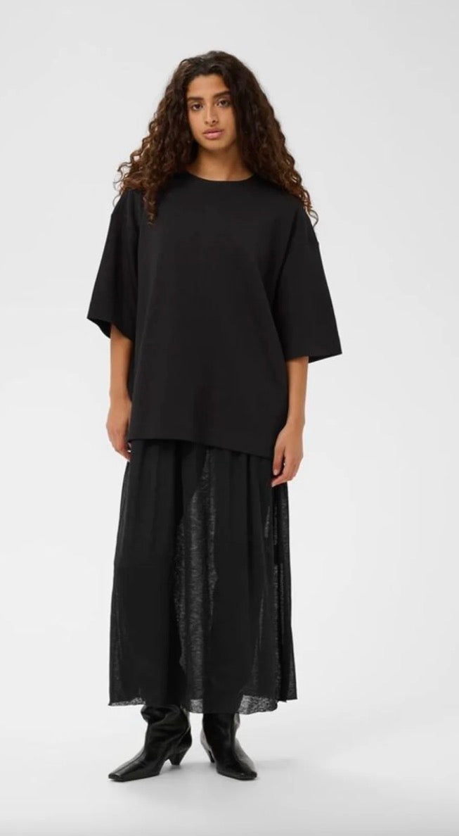 The Vincent Dress in Black is an exercise in effortless elegance. Designed in a soft knitted quality, it features a relaxed silhouette with above-elbow sleeves and a fluid, long-length skirt that moves beautifully with the body. The modal-rich blend feels smooth and comfortable against the skin, while the clean lines keep the look pared back and polished.