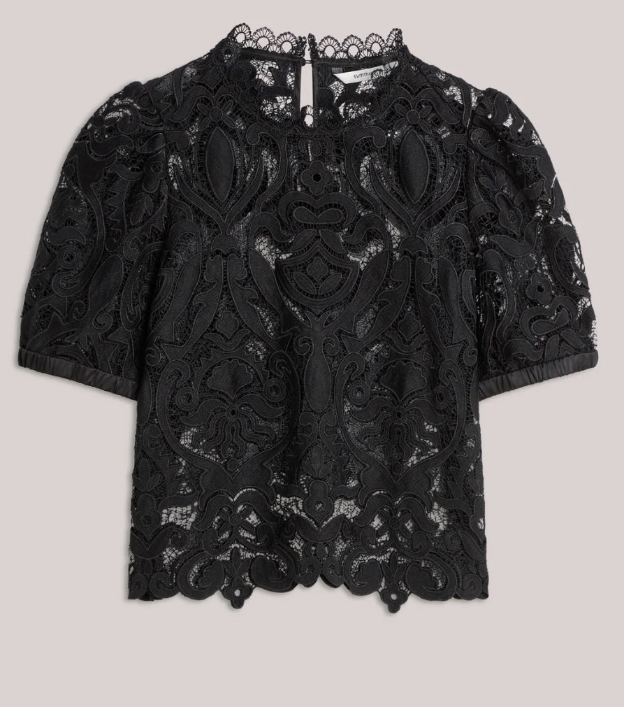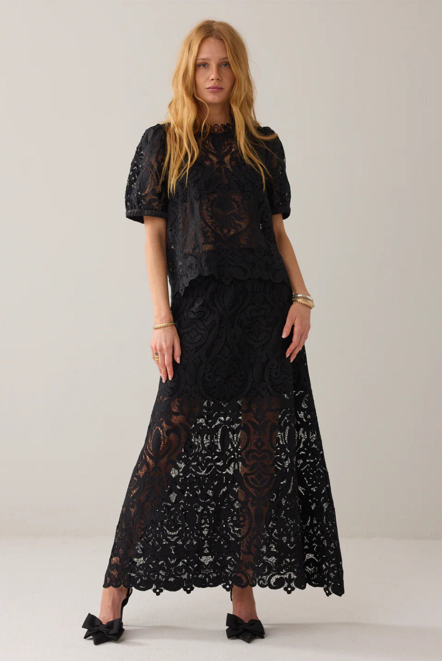 Boxy lace top with short puff sleeves and satin trim at the cuffs. The neckline and bottom are finished with a lace scalloped edge. The blouse has a slit with a button fastening at the neck. Combine this top with the matching skirt: 6s1331.