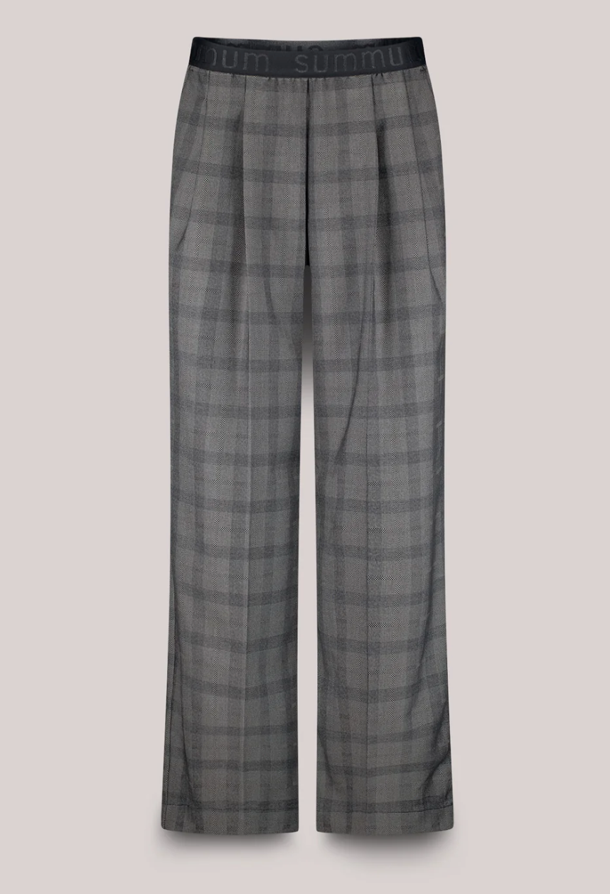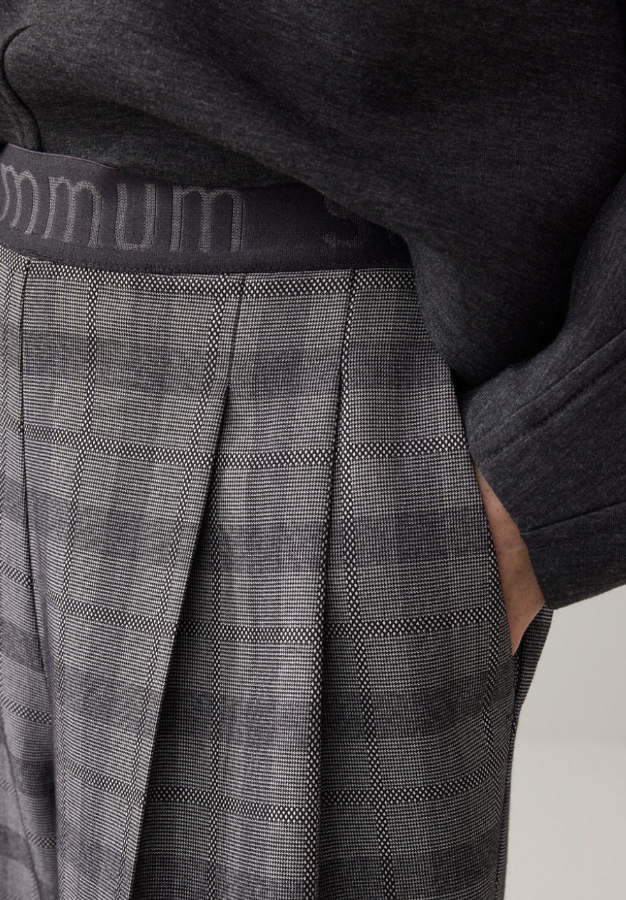 Designed in a plaid fabric, these wide-leg trousers feature a Summum elasticated waistband. A press crease runs across the front from the waistband pleats. The trousers have slit pockets at the front and fake strip pockets at the back.