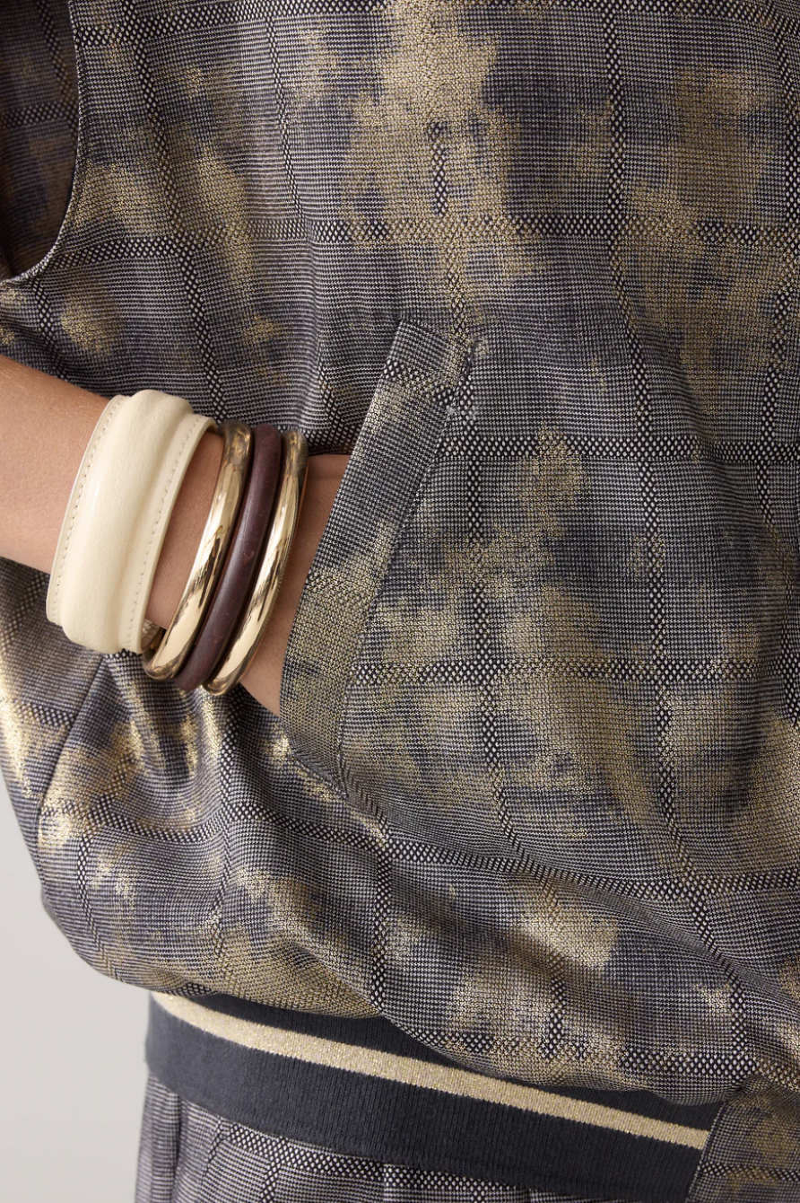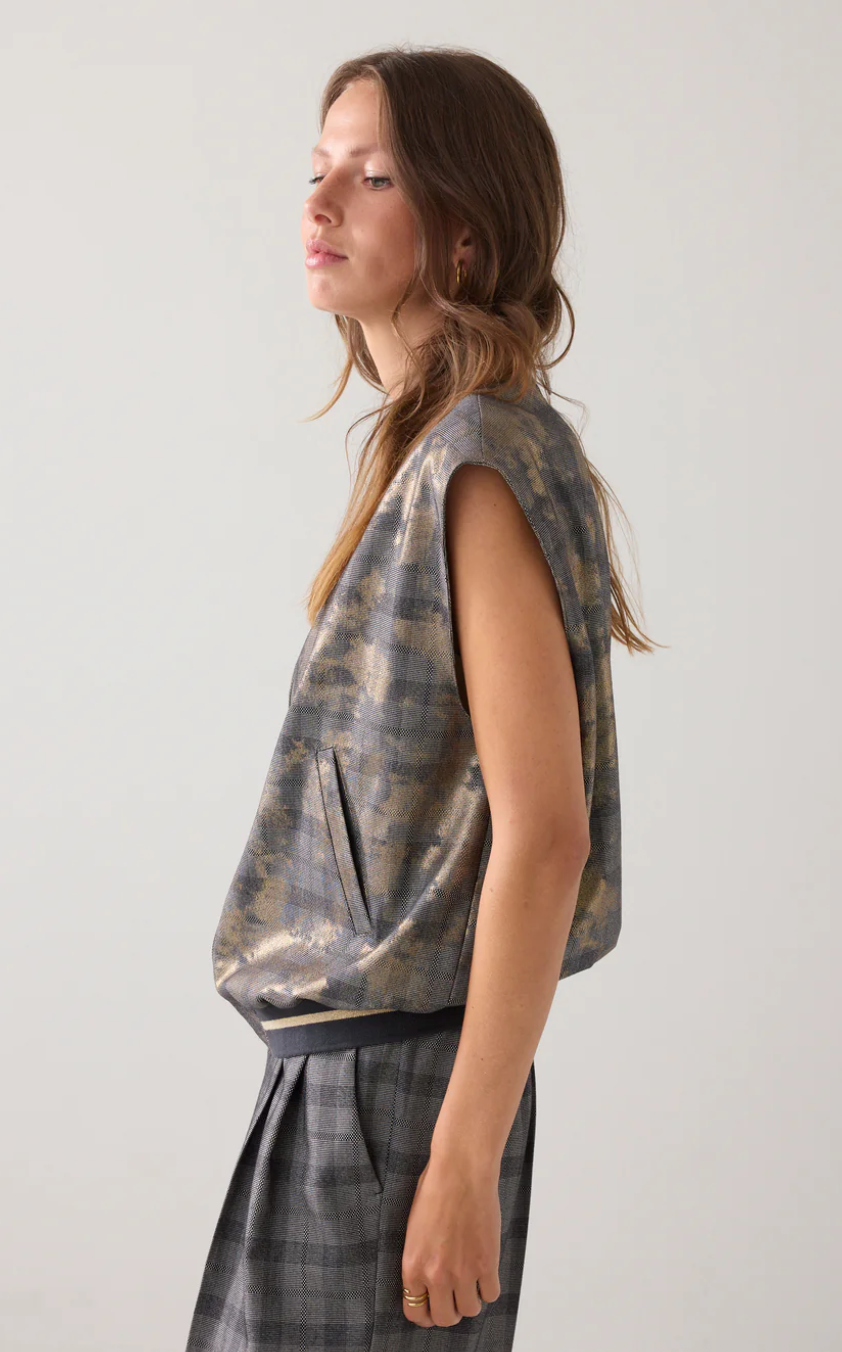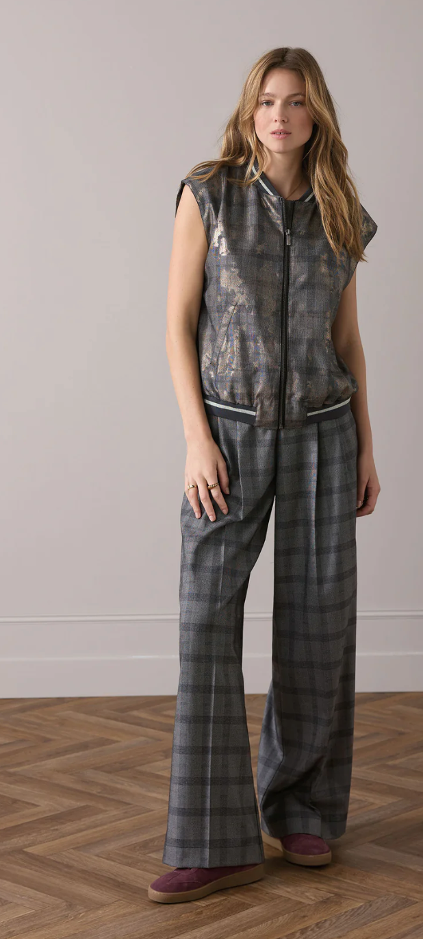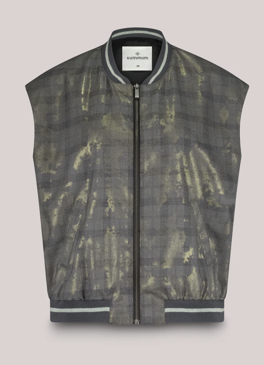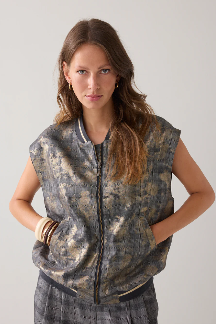 This bomber-style gilet features a foil print in a plaid fabric and has a lurex stripe in the ribbed edging. The gilet has wide armholes, flap pockets and a wind catcher behind the zip.