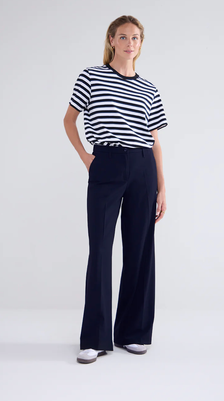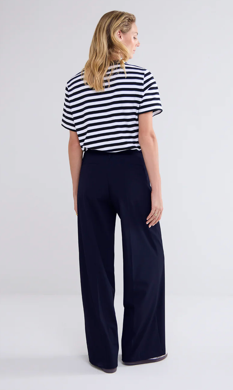 Effortlessly chic and supremely comfortable, these navy wide-leg trousers deliver relaxed elegance for any occasion. The elasticated back waist ensures a perfect fit without compromising on style, while the flowing silhouette flatters every frame. Practical slit pockets at the front keep essentials within reach, complemented by convenient strip pockets at the back. A versatile wardrobe essential that transitions seamlessly from day to night.
