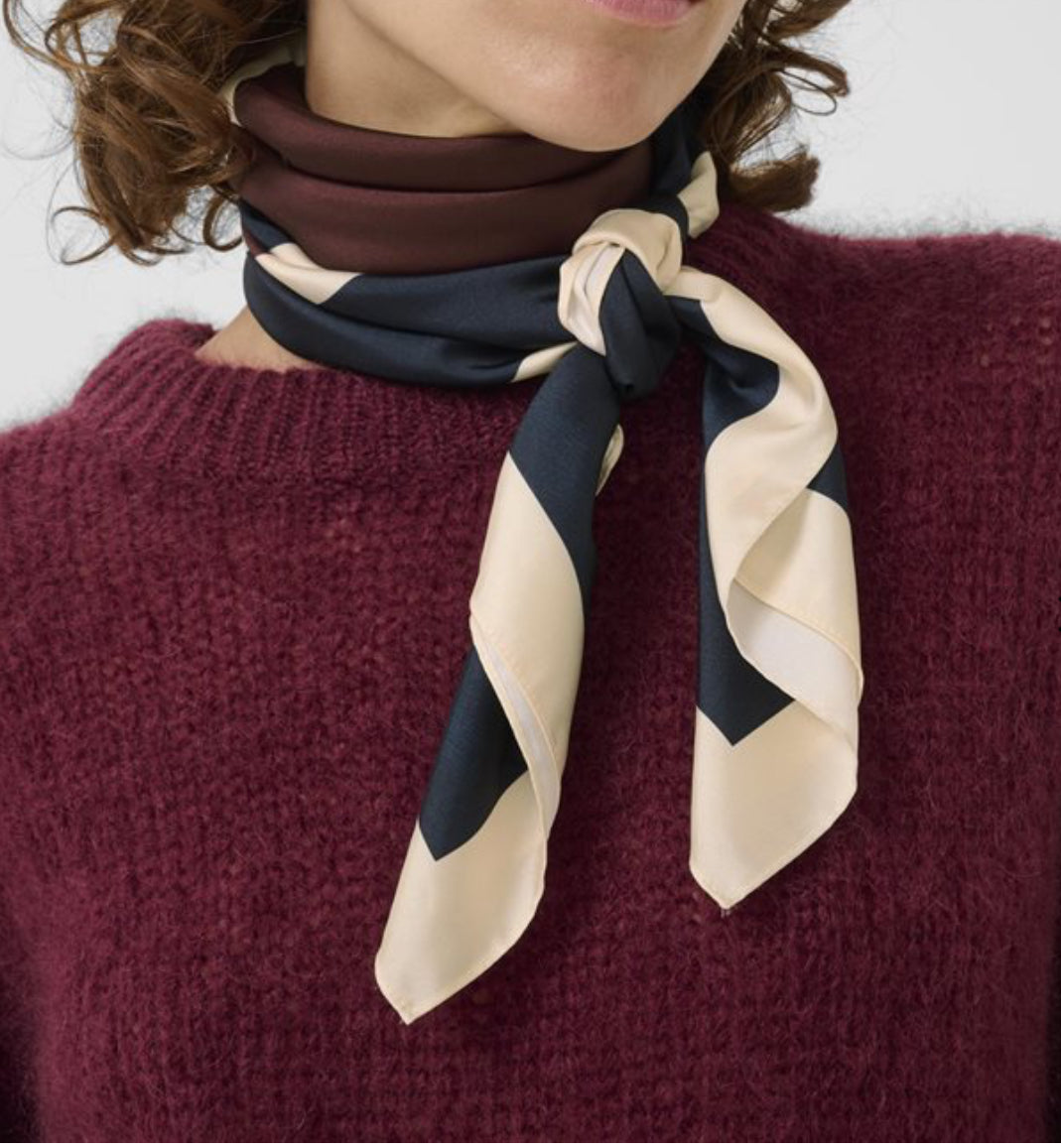 Satin scarf in navy, tawny port and buttermilk geometric print. Use as a neck scarf, or tie into your bag to stylishly finish off your Autumn look!