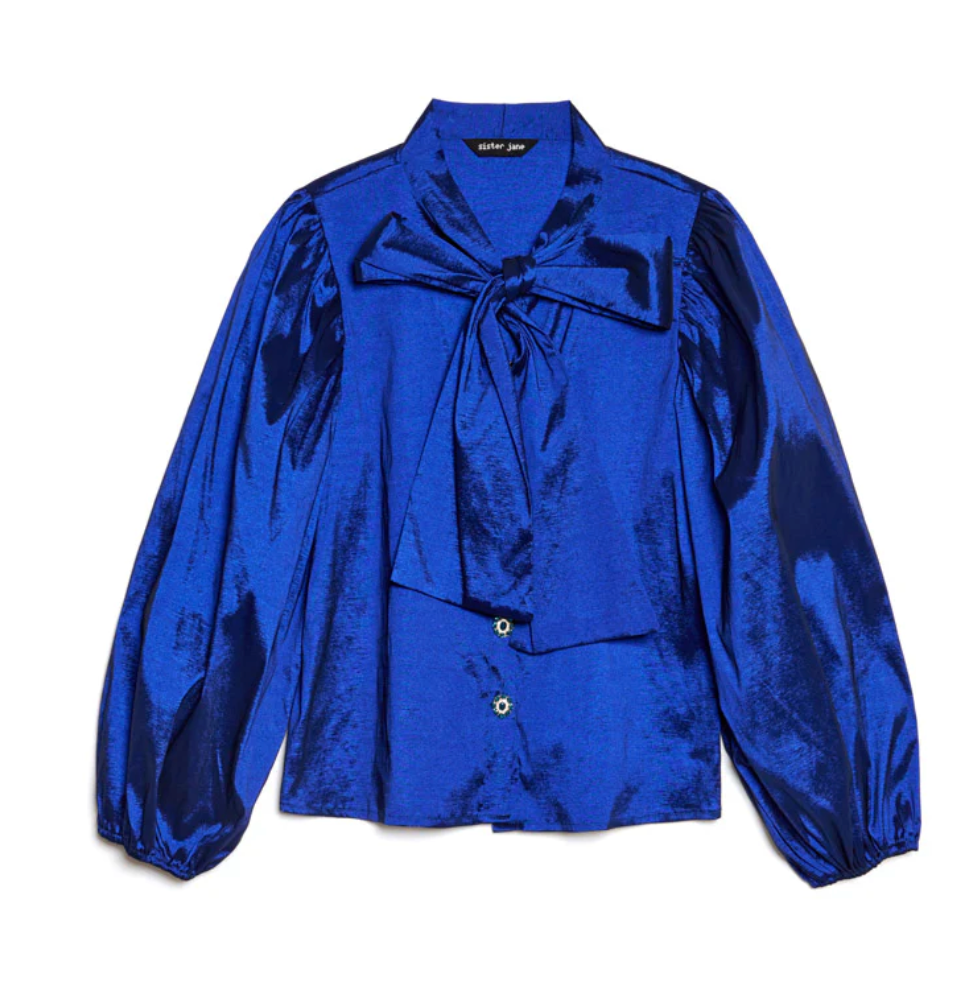 The Marylin Taffeta Bow Blouse commands attention with its graceful flow alongside every step you take. Featuring a chic gem-buttoned front and an elegant sweeping bow tie, it perfectly balances strength and charm.