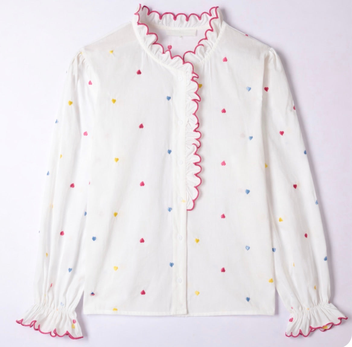 Add a playful yet refined touch to your wardrobe with this delicate off-white blouse. Crafted from a lightweight, semi-sheer fabric, it features scattered multi-colored heart embroidery that brings a subtle pop of color to a clean, feminine silhouette.