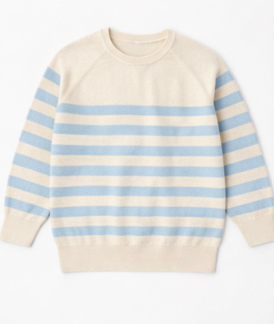 Crew Neck Sweater in soft blue and cream, the perfect accompaniment to your favourite jeans.