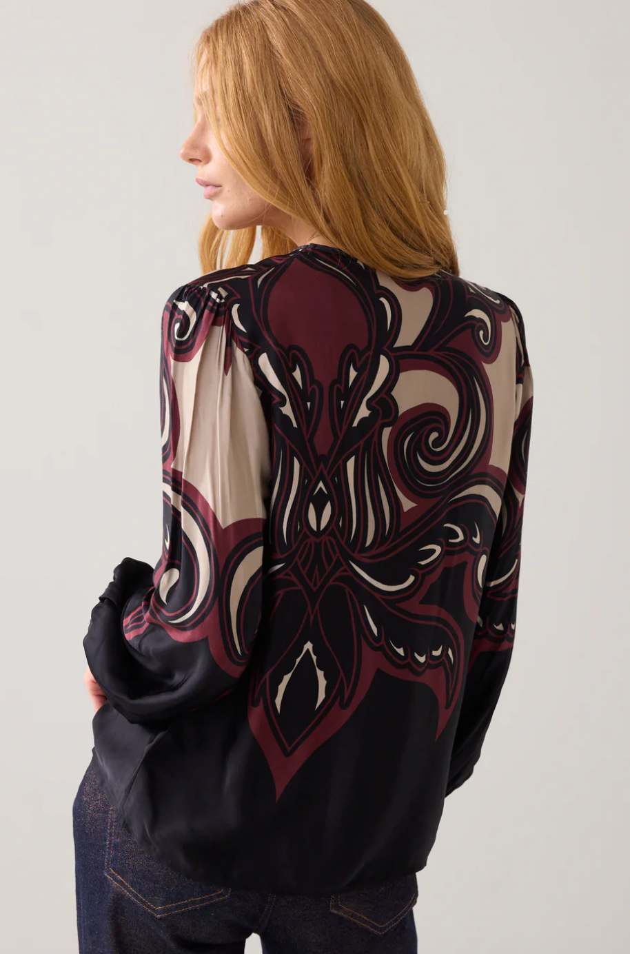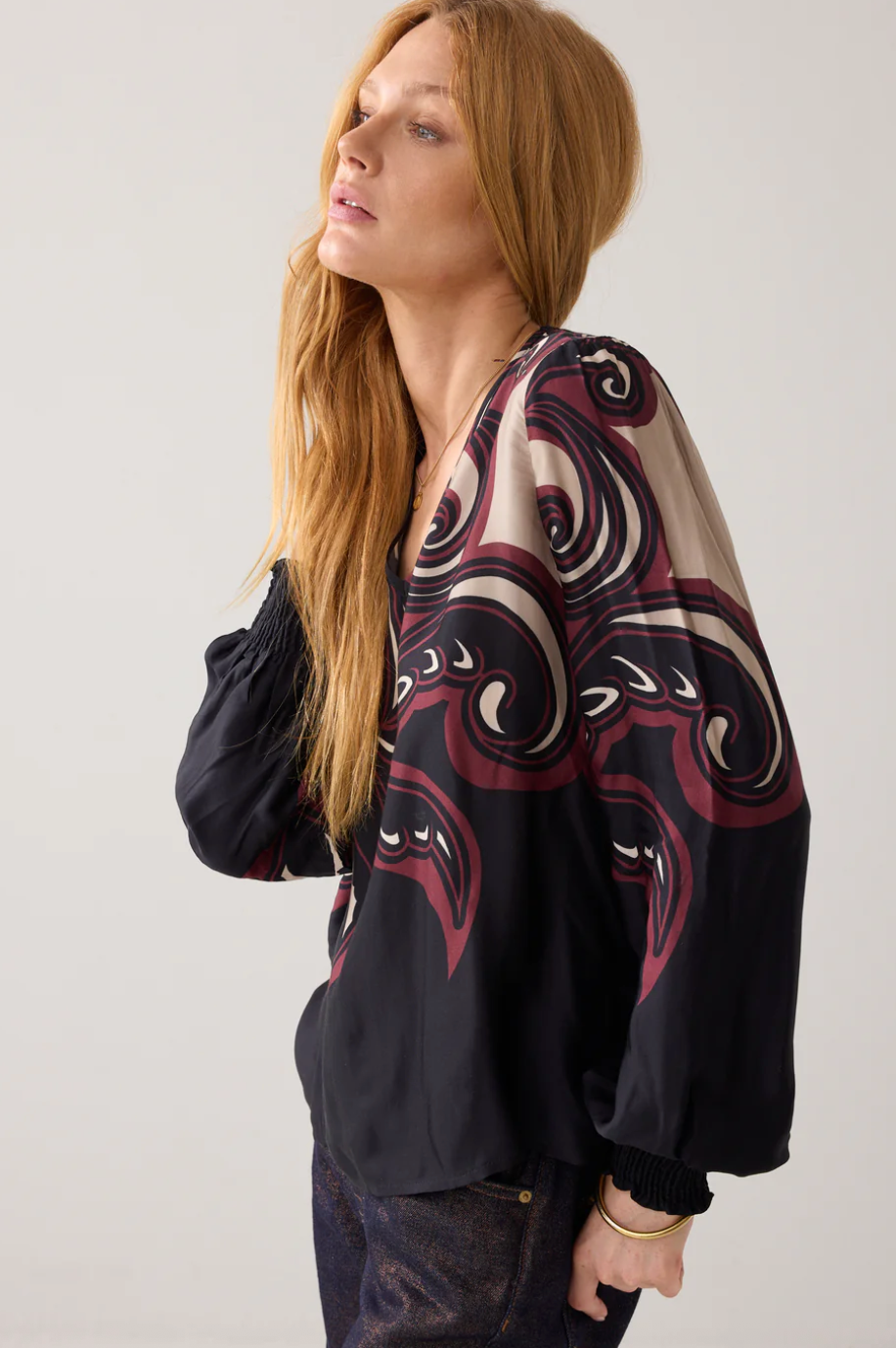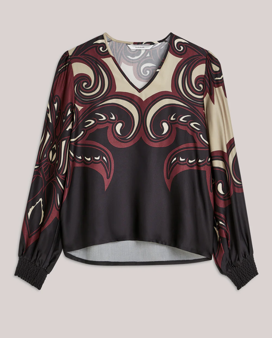 Top in satin viscose with a V-neck and straight cut. Each top is unique due to the random placement of the ornament print. The top has wide sleeves with fully smocked cuffs.