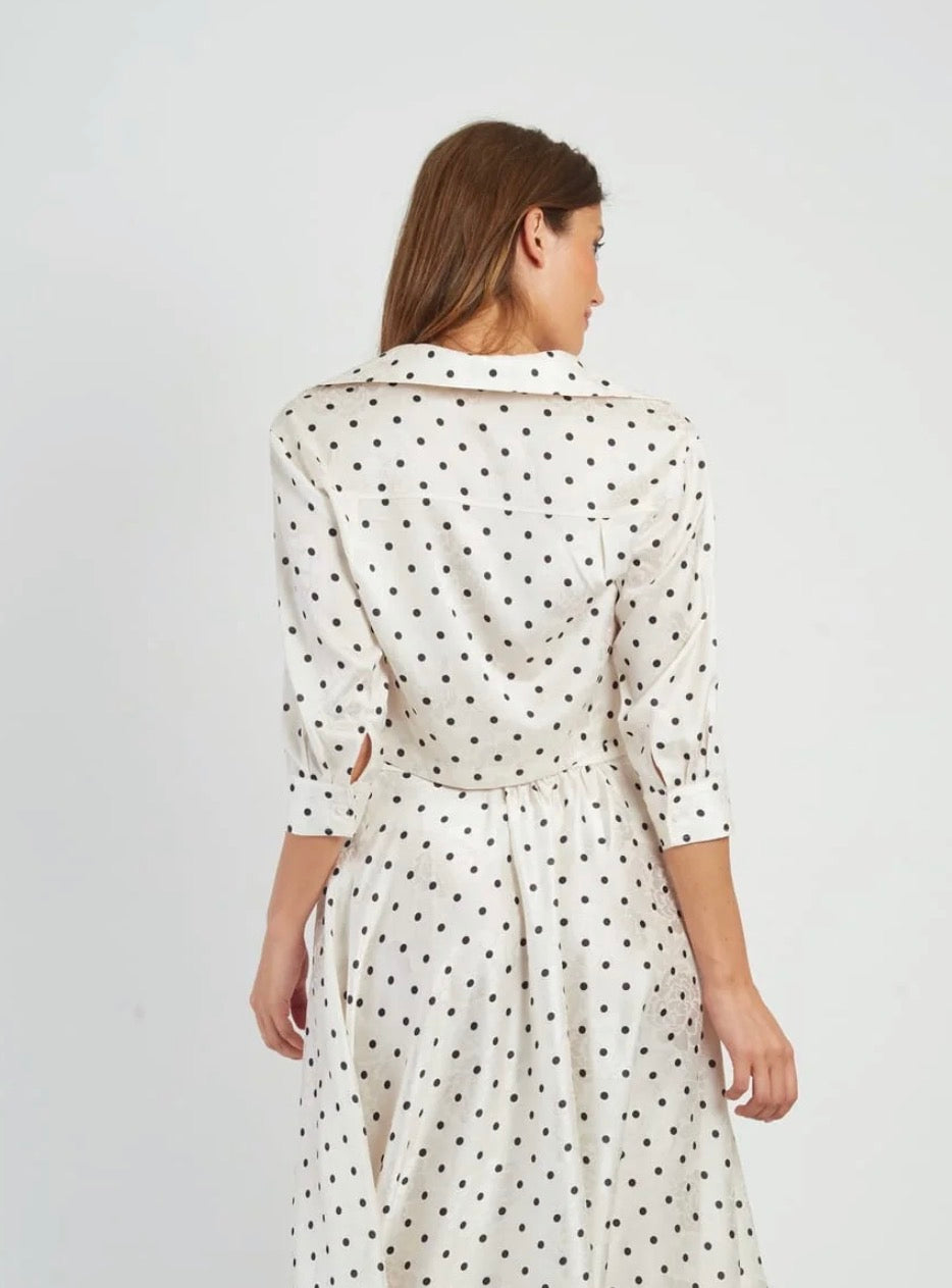 A timeless polka-dot blouse designed with effortless elegance. Featuring a classic shirt collar with lapels and three-quarter sleeves, this piece offers a refined yet relaxed look. The straight cut is subtly tailored at the waist to create a flattering silhouette, while the front button closure adds a touch of classic sophistication. Crafted with carefully finished cuffs and an evenly distributed polka-dot print, this blouse is perfect for both everyday wear and elevated styling.