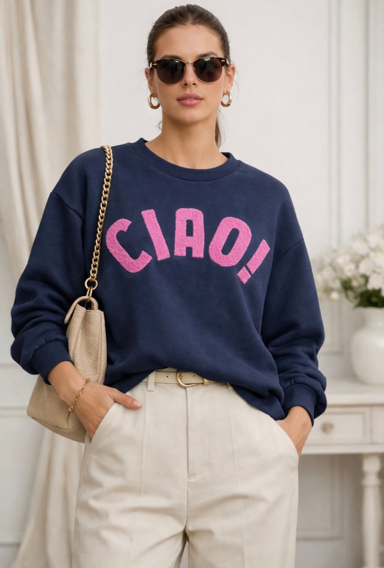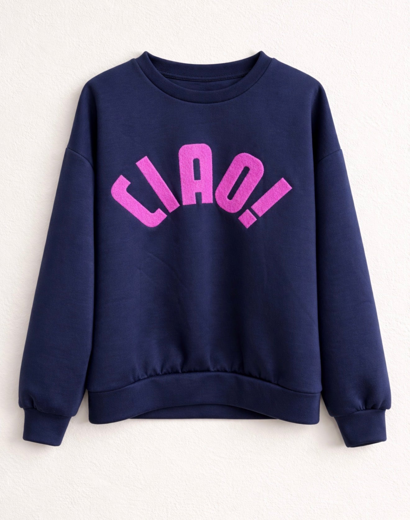 Say it with style. This relaxed-fit sweatshirt brings an easy, feel-good attitude to everyday dressing, finished with a bold CIAO! statement across the front. Made in Italy from a supersoft fabric, it’s the kind of piece you’ll reach for again and again—casual, cool, and quietly confident.