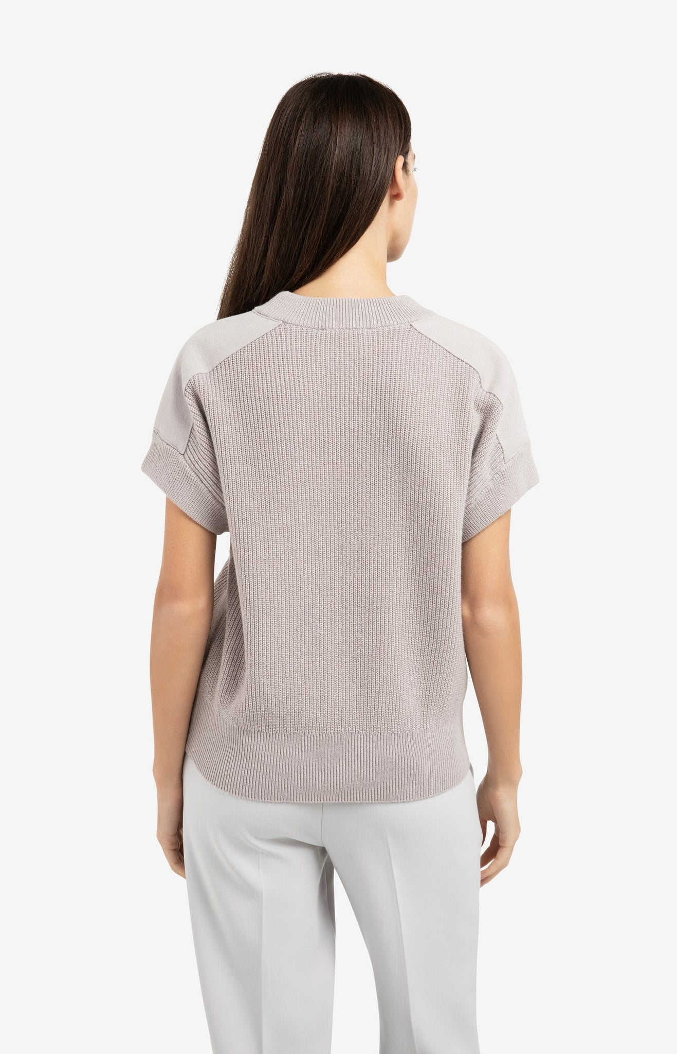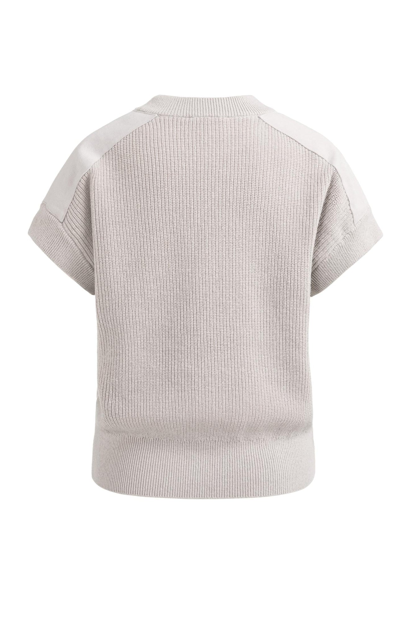 This knitted top is designed with short sleeves, a round neckline, and a regular fit. The woven inserts on the shoulders create a subtle contrast in texture and add a modern twist to the design. Made from a soft cotton blend, its perfect for layered looks or to wear on its own. The model is 175 cm and wears size S.
