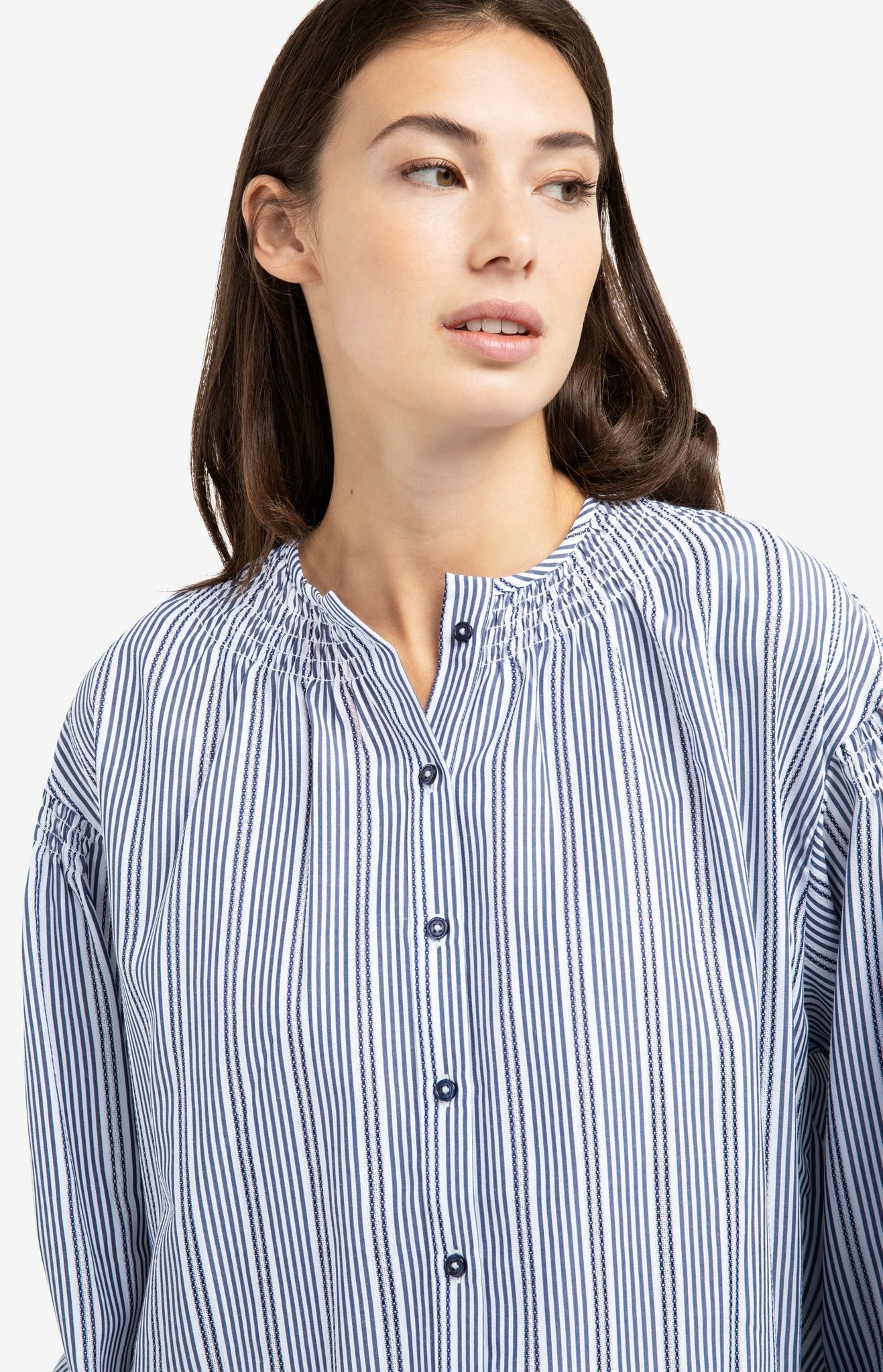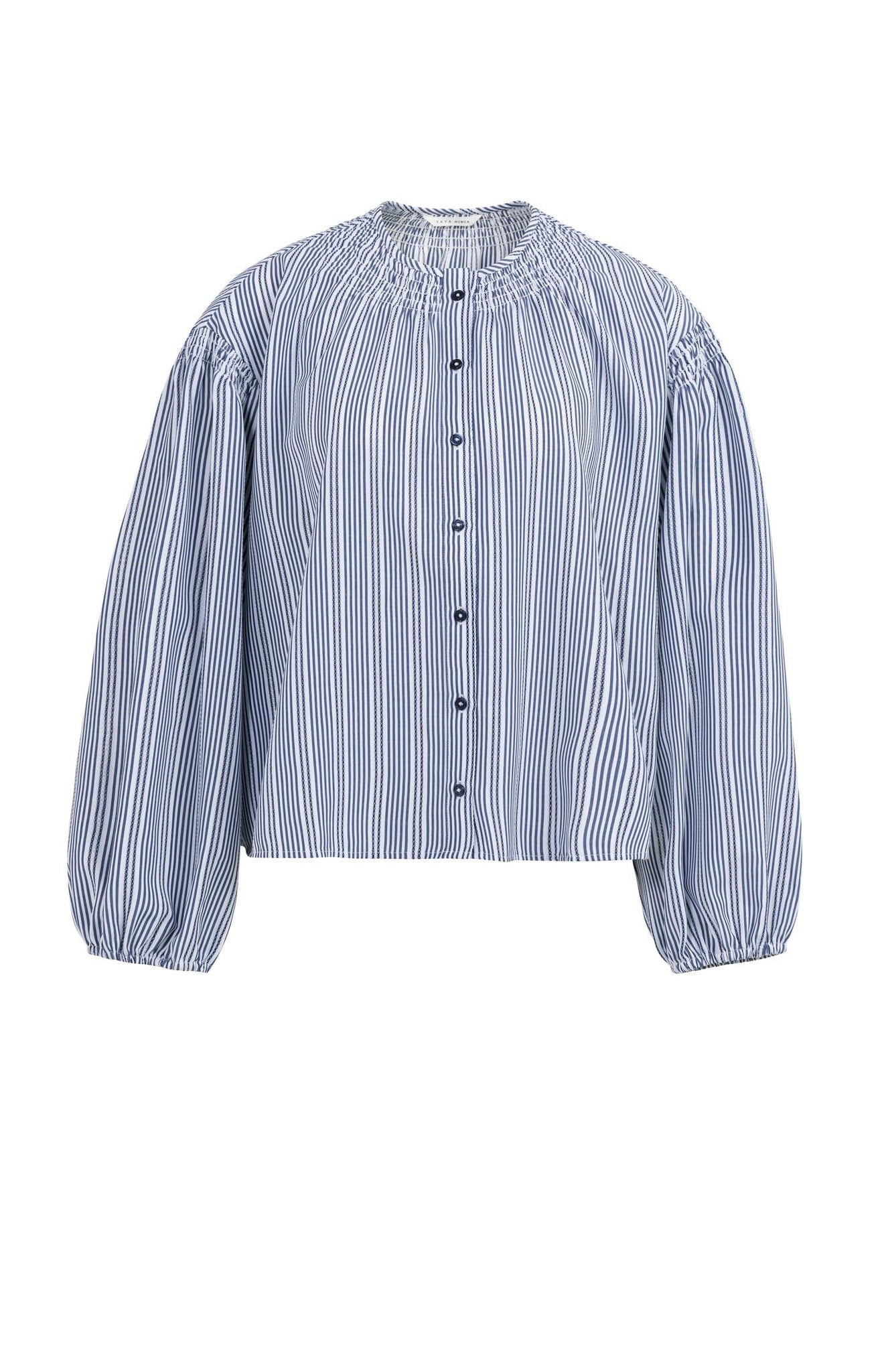 This striped blouse is made from a light cotton blend and features a round neckline with delicate shirring. The long puffed sleeves are finished with elastic cuffs. Designed in a loose fit with front button closure, this blouse adds a feminine touch to any casual or chic outfit. The model is 175 cm and wears size 36.