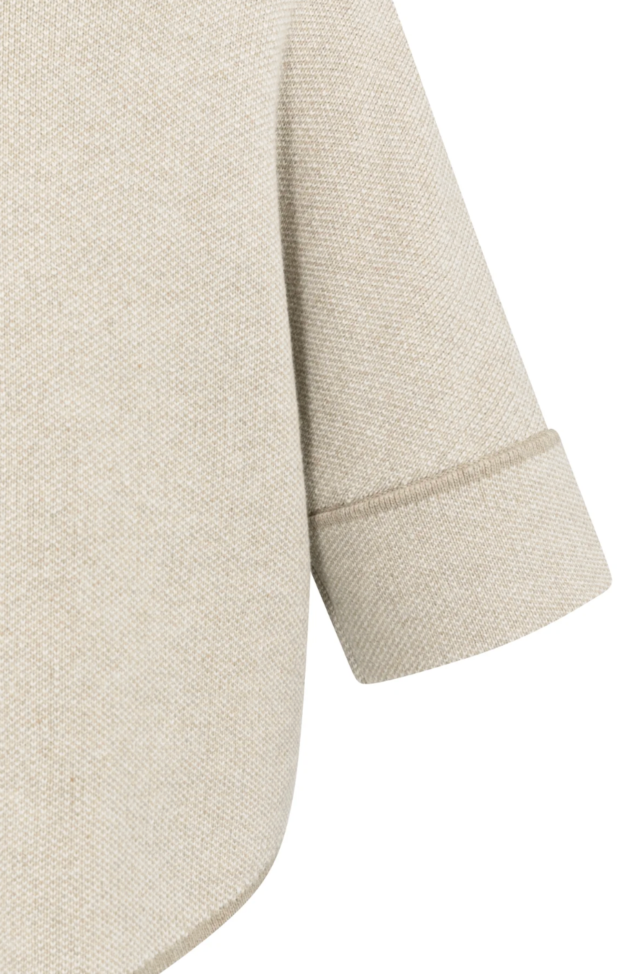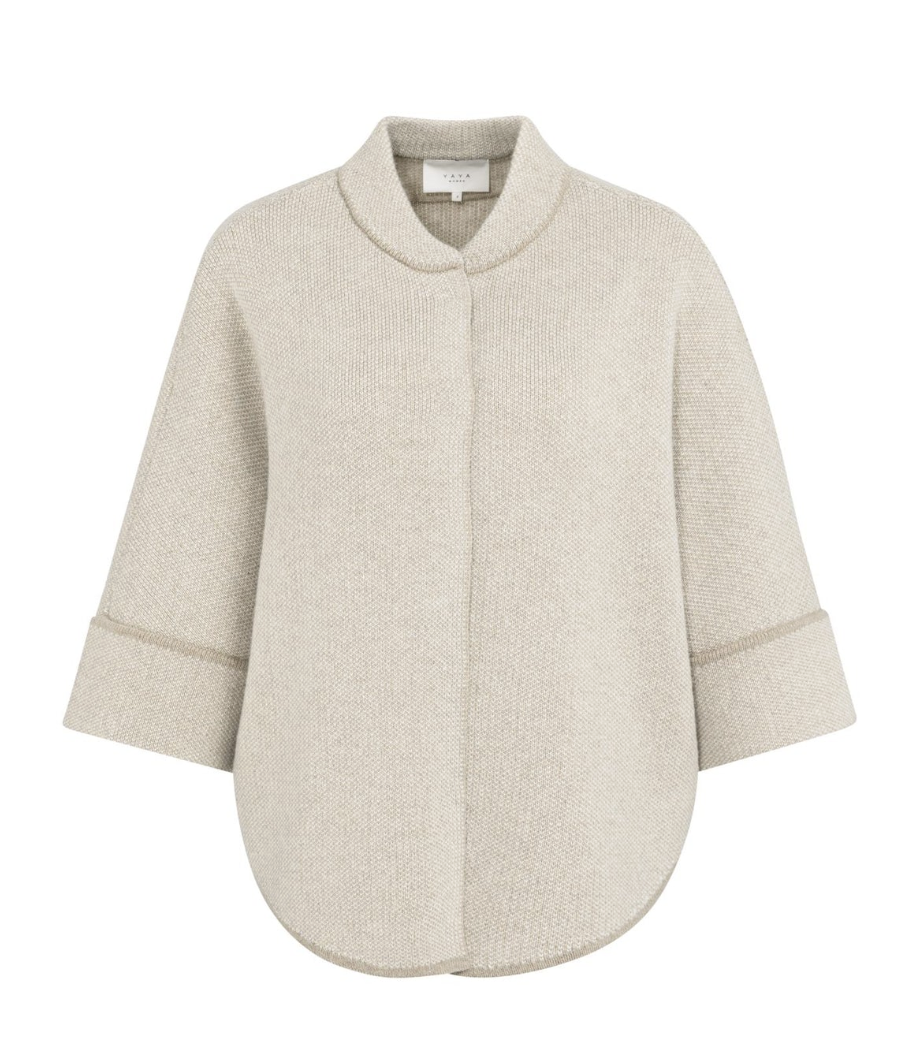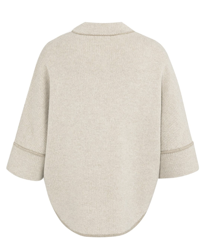 This elegant poncho cardigan is jacquard knitted and features an oversized fit with a rounded hem. The three-quarter sleeves and soft fabric offer a comfortable and stylish look. Finished with a subtle collar and visible seam details for a modern touch. Perfect for layered outfits. The model is 175 cm and wears size 2.
