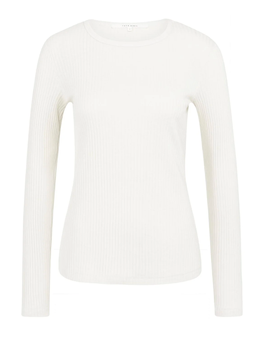 his comfortable long sleeve shirt is crafted from a soft ribbed fabric and features a round neckline and fitted silhouette. The slim fit flatters the figure and makes it perfect to wear on its own or layered under a cardigan or jacket. A timeless and versatile wardrobe essential in a neutral tone. The model is 175 cm and wears size S.