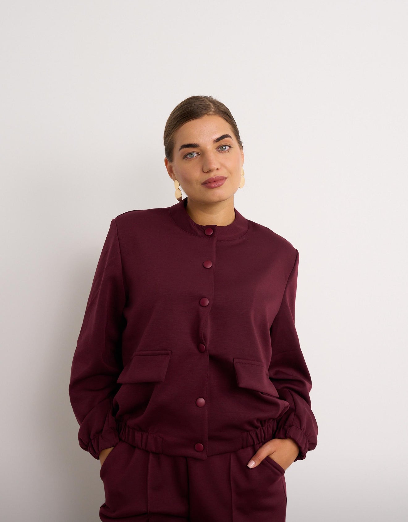 The jacket has a structured yet relaxed silhouette with a round neckline, covered buttons, and front patch pockets — details that elevate it beyond typical loungewear. The sleeves are softly gathered at the cuffs, giving a polished finish.