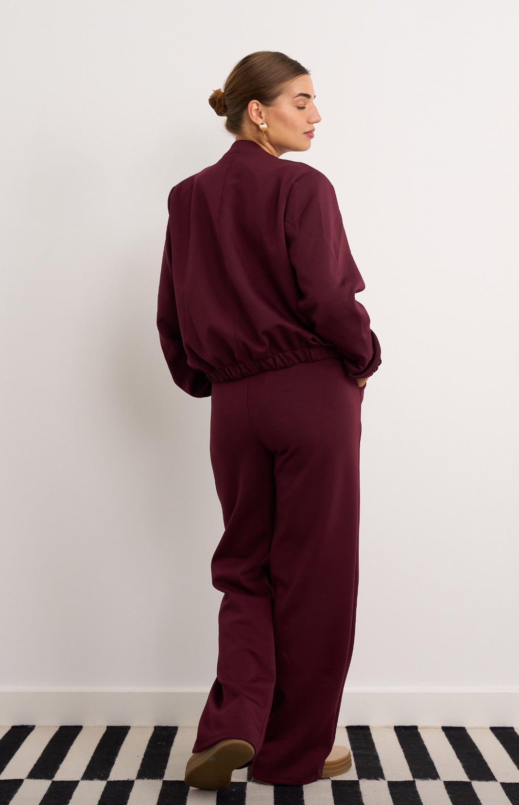 This luxe lounge set is a refined take on casual comfort, blending elegance with ease. It features a deep burgundy hue that adds a sophisticated richness to the look.