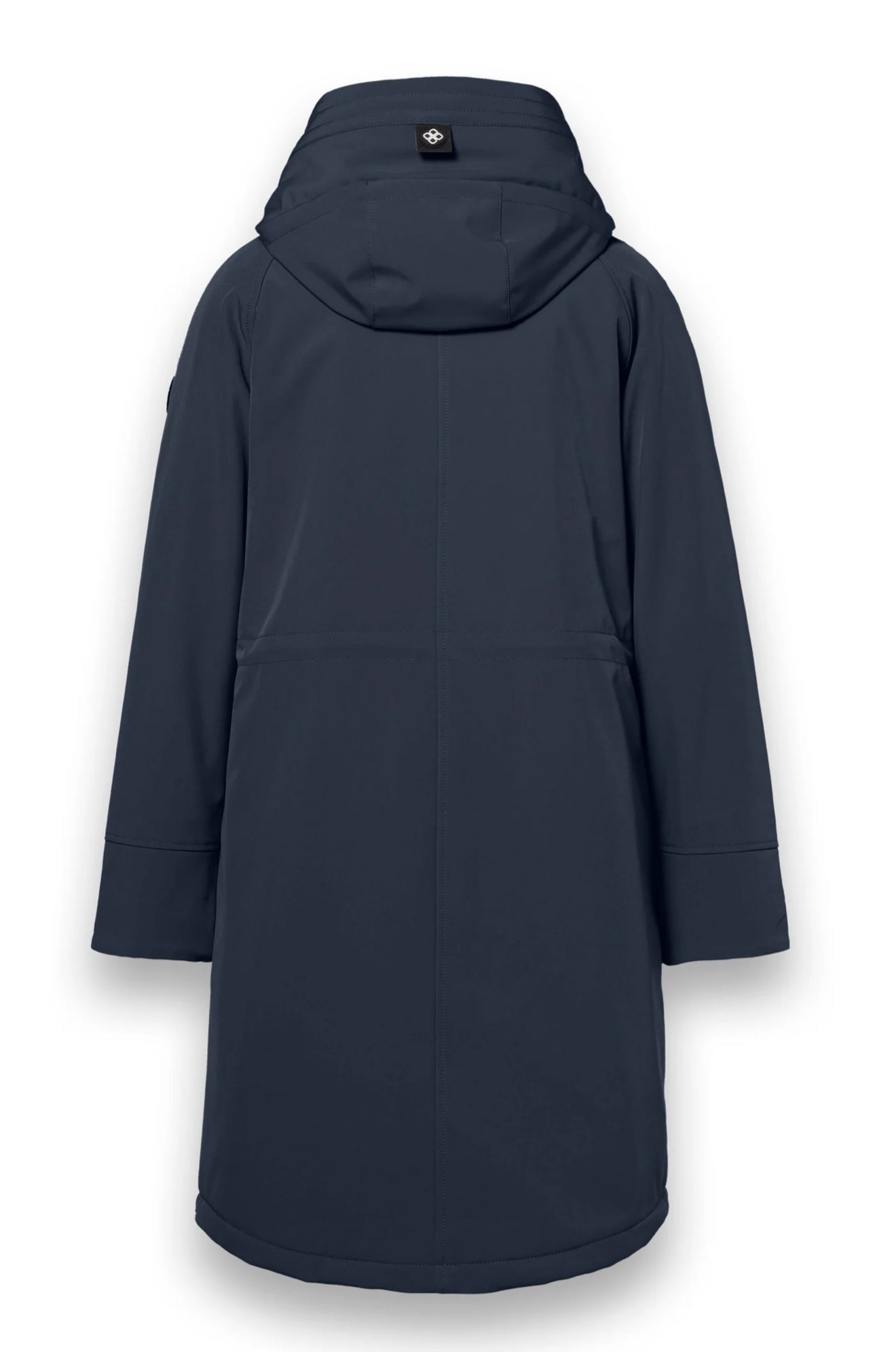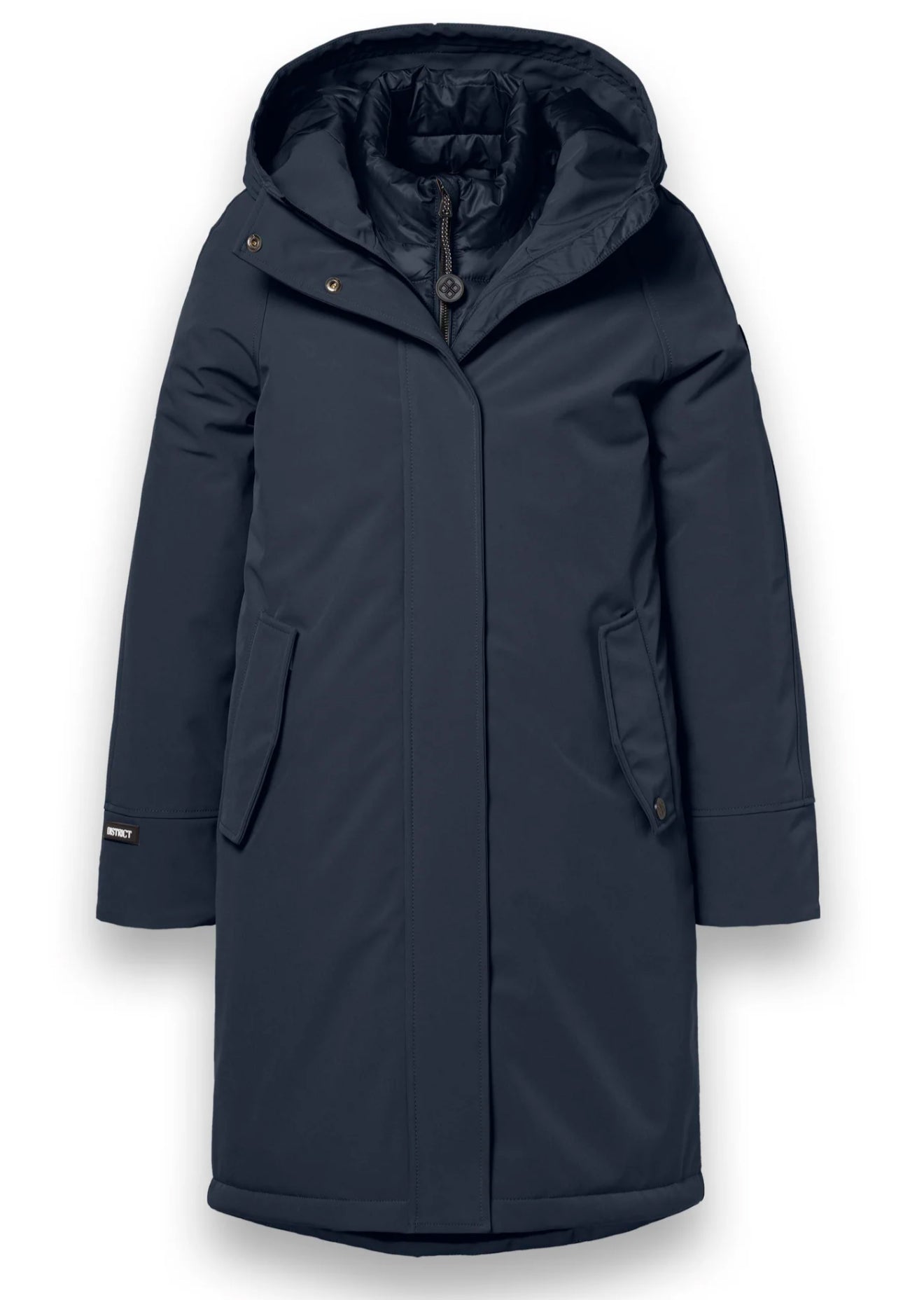 Functional long coat, breathable, water-repellent, and windproof with removable quilted "innerfacing" for extra warmth on cold winter days. Spacious quilted hood. Two large flap pockets with snap buttons. Hood and sleeves with bold rubber 3D badges. Robust quilted lining with DISTRICT logo tape and zippered inner pocket. Drawcords inside for extra waist definition. Ribbed wind catchers in cuffs.