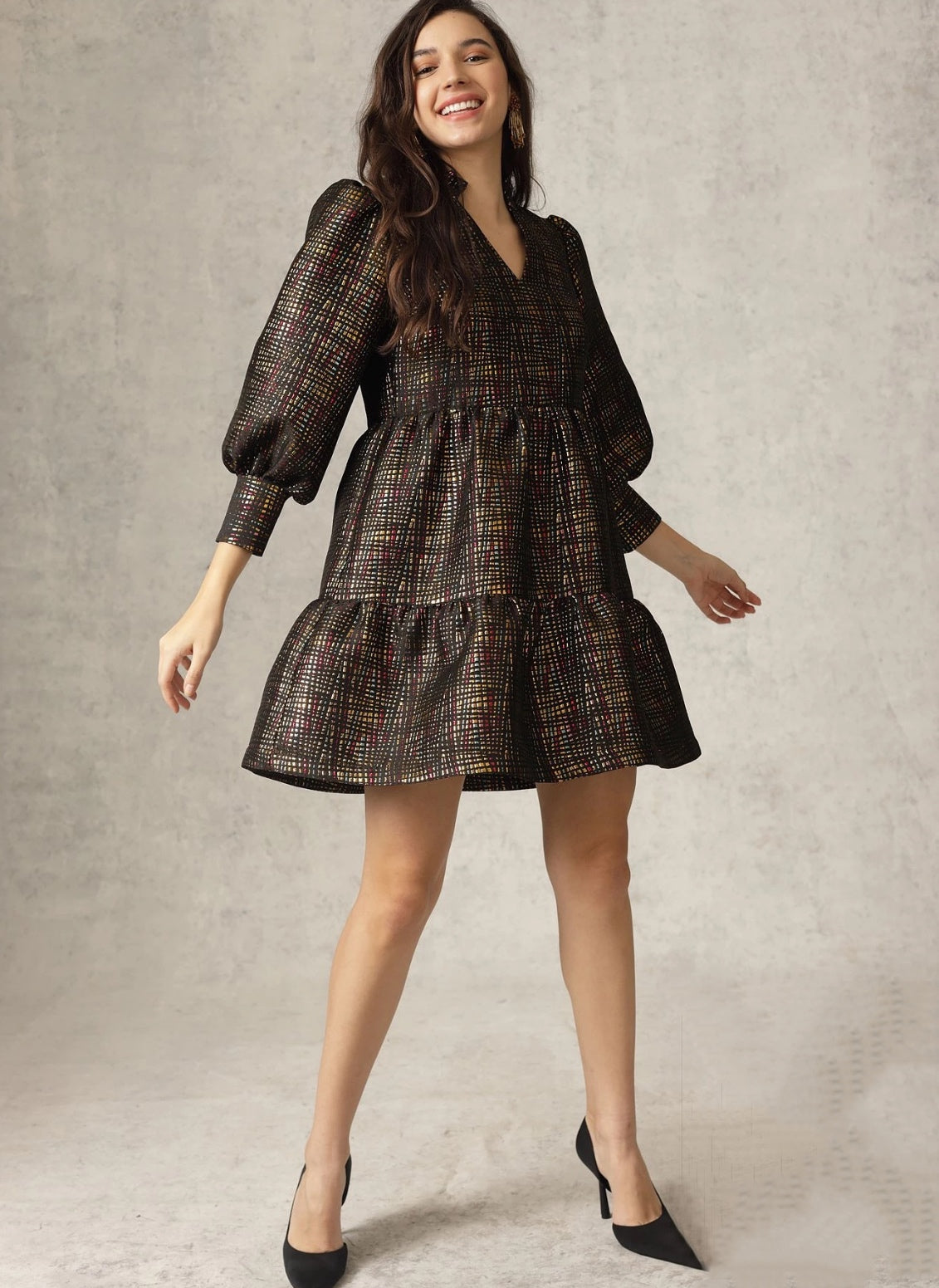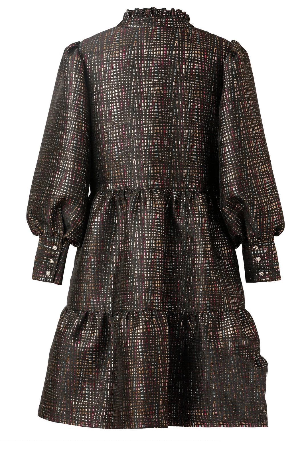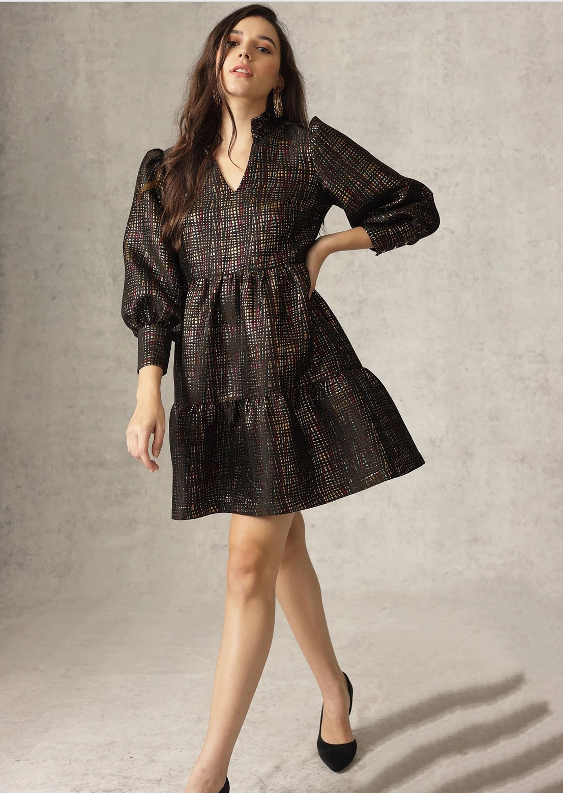 Metallic jacquard dress with v neck and drop waist, falls above the knee.
