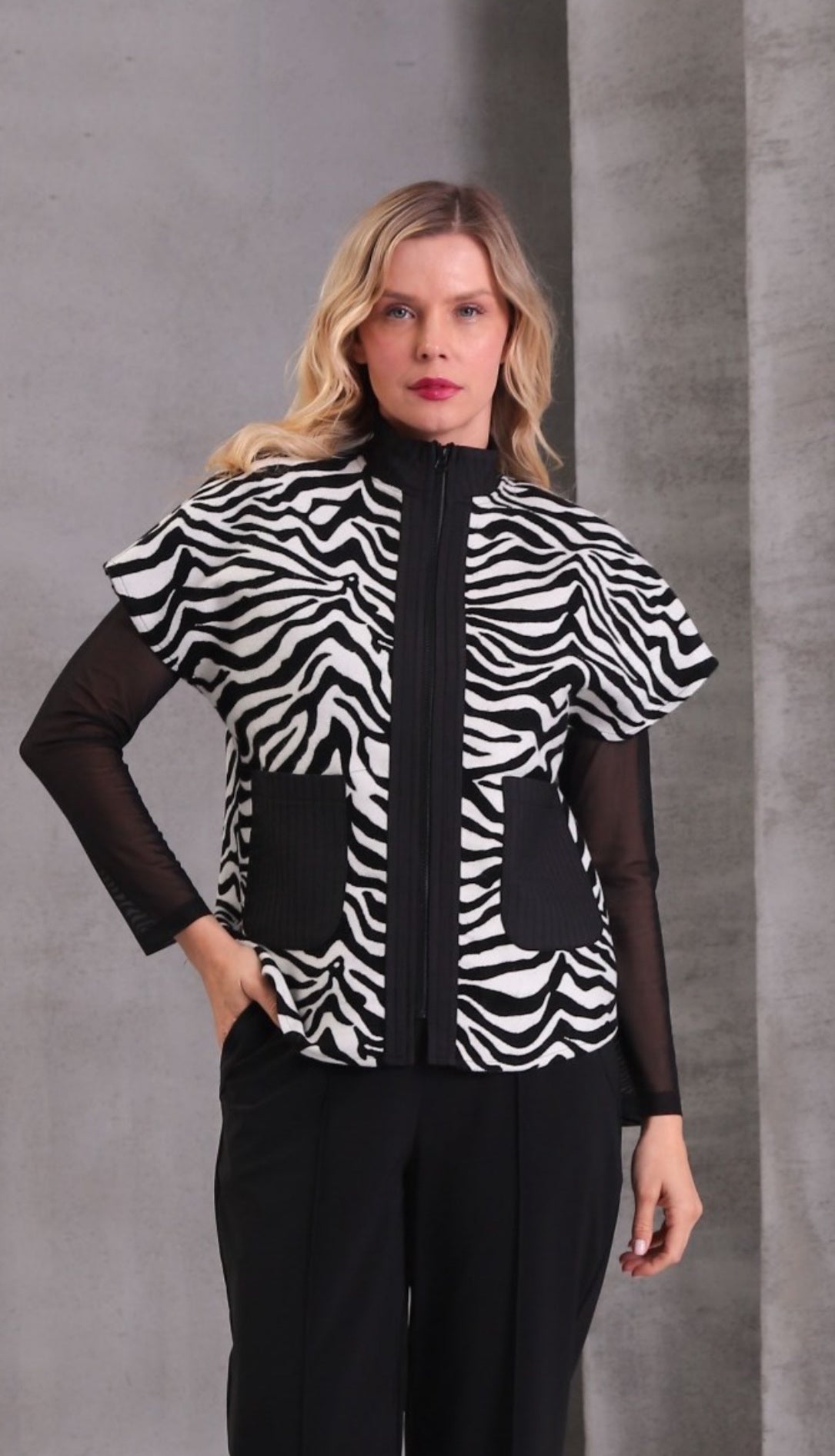 This Gilet is a stylish and versatile addition to any wardrobe. With its eye-catching zebra print design, black trim zip, and pockets, it adds a touch of personality to any outfit. Plus, the lightweight and breathable material make it perfect for layering in any season.