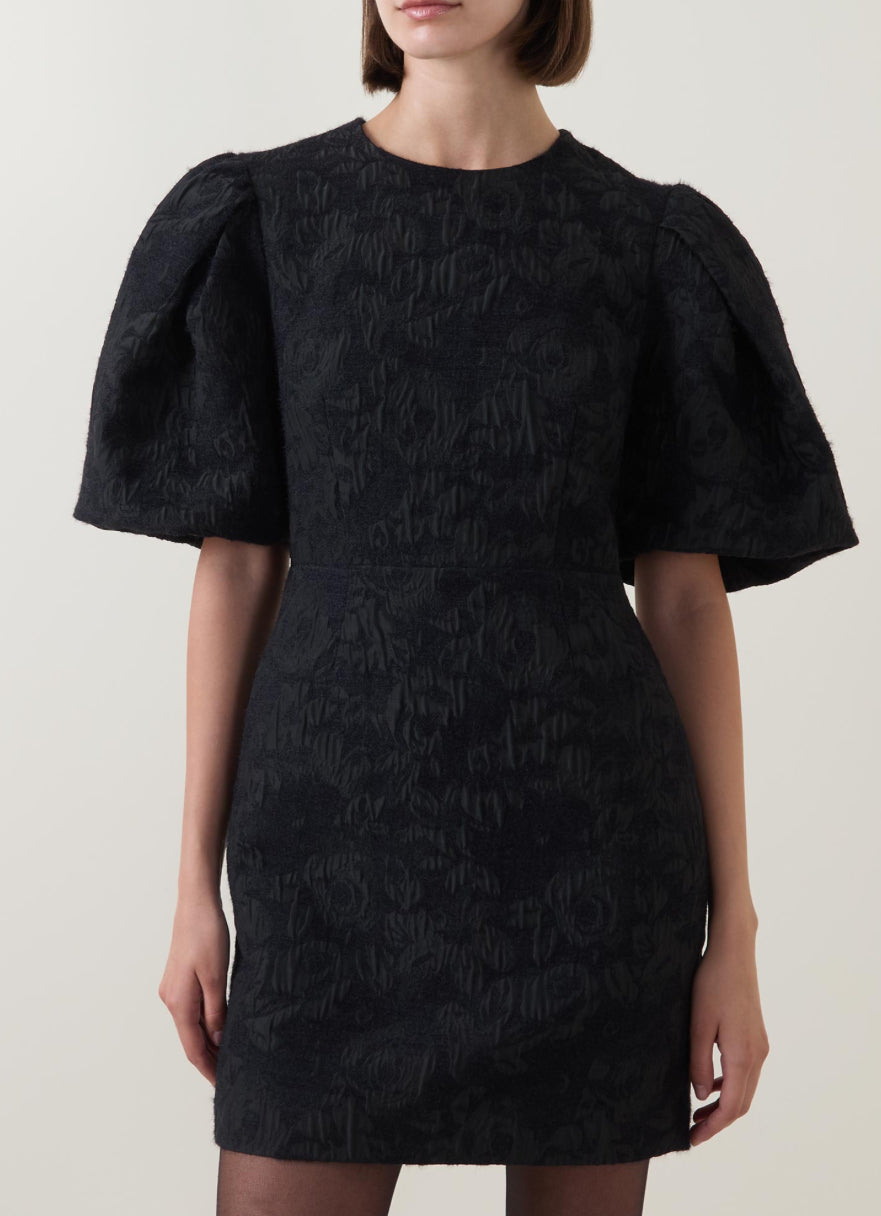 Structured with a sophisticated jacquard fabric, this mini dress showcases an exaggerated puff sleeve for an elegant and refined look.