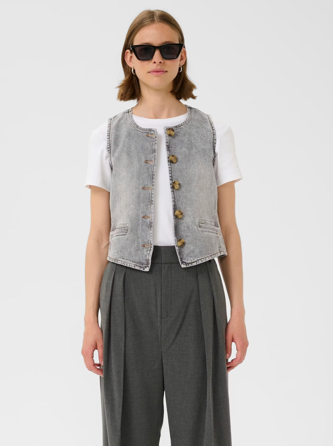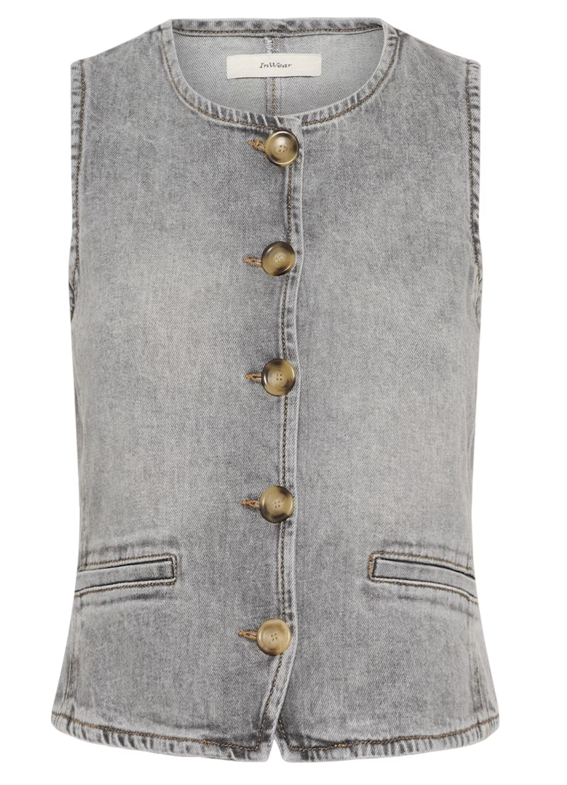 This denim waistcoat offers a comfortable relaxed fit with a round neckline and button fastening, making it a versatile addition to your wardrobe. Perfect for smart-casual ensembles, it layers easily to complement any outfit or event.